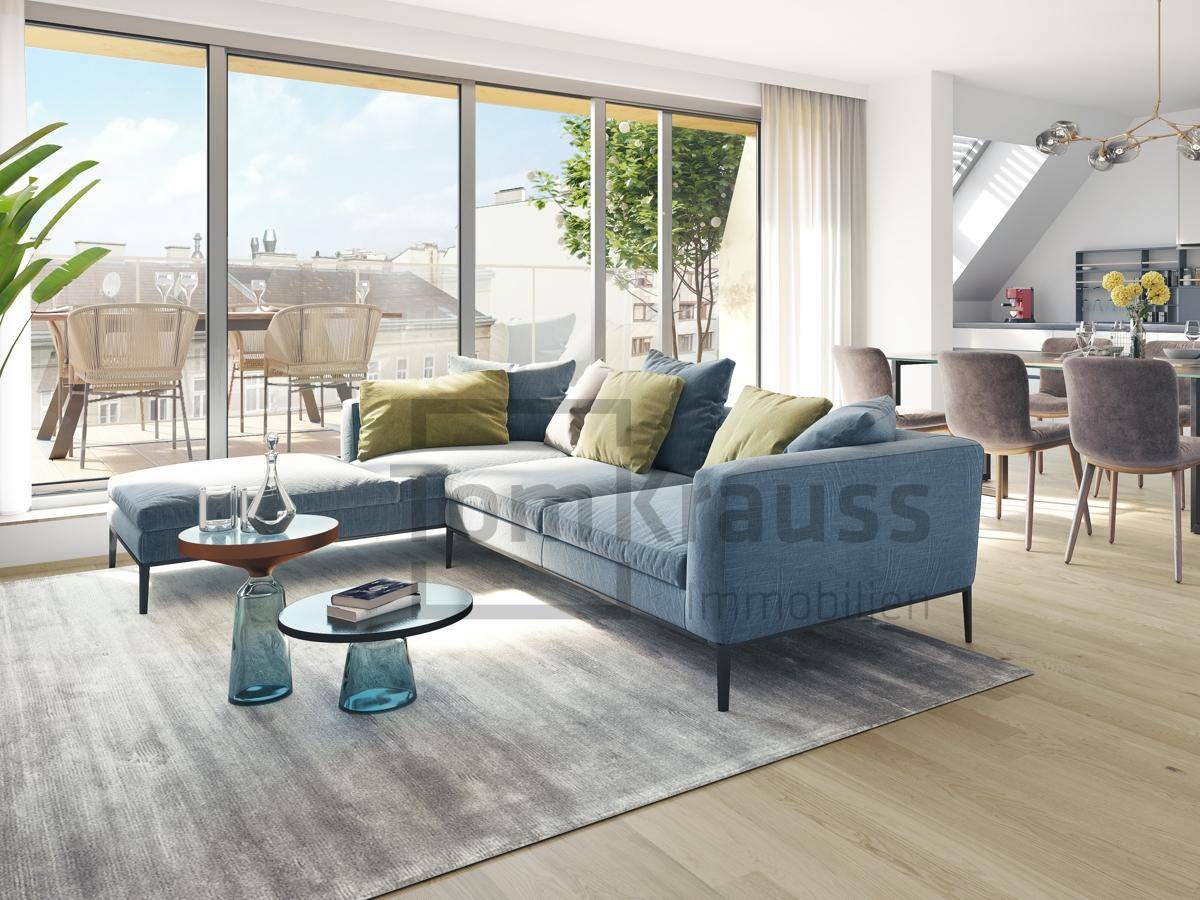 Diese luxuriöse 2-Zimmer Wohnung liegt im 2. Dachgeschoss und zeichnet sich durch ihren smarten Grundriss aus. Die geräumige und helle Wohnküche besteht aus einem hofseitig ausgerichtetem Küchenbereich mit Kochinsel und Ausgang auf die kleine Terrasse sowie einem einladenden Wohnbereich - straßenseitig. Weiters gibt es ein Schlafzimmer mit einem abgetrennten Bereich für den begehbaren Kleiderschrank. Ein Bad on Suite mit Dusche sowie eine Gästetoilette runden das Angebot ab. Ideal für junge Paare mit gehobenen Ansprüchen. In sehr guter Lage Nähe Wallensteinplatz entsteht das exklusive Wohnprojekt „Der Goldene Strauß“. Die Lage überzeugt mit urbanem Flair und rascher Erreichbarkeit ins Grüne. Der in unmittelbarer Nähe gelegene Augarten und Donaukanal laden zum Erholen und Entspannen unter freiem Himmel ein. Der Neubau bietet kompakte 1-Zimmer- Apartments, sowie 2- bis 3-Zimmer-Wohnungen von ca. 28 bis 85 m². Die ost- und westseitige Orientierung der Wohnungen garantiert, in Verbindung mit bodentiefen Verglasungen, lichtdurchflutete Wohnräume sowohl in den Morgen- als auch in den Abendstunden.