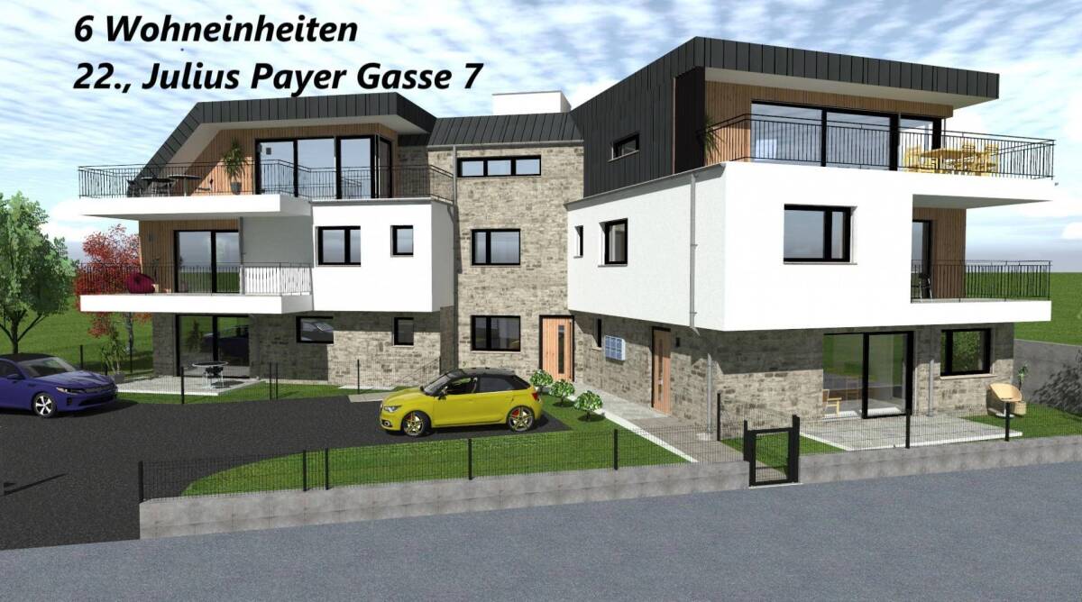 Das Projekt KAISERMÜHLEN LIVING wird in der Julius Payer Gasse 7 im 22ten Wiener Gemeindebezirk Kagran wird von der Fa 2LIVING ROHA Immobiien GmbH entwickelt. Es handelt sich um einen Baurechtsgrund des Stifts Klosterneuburg mit 100 Jahren Laufzeit und Option zur Verlängerung.Die Fa. Schwarhofer Planung und Bau GmbH als wirtschaftlicher Baurechtseigentümer der Liegenschaft ist Mitgesellschafter der Fa. 2Living ROHA Immobilien GmbH.Die Liegenschaft – mit Blick auf das Kaiserwasser - befindet sich in Kaisermühlen, einem der attraktivsten Stadtviertel Wiens, welche aufgrund seiner zentralen Lage mit guter Anbindung an den öffentlichen Verkehr sowie einer Vielzahl an Erholungsgebieten in unmittelbarer Umgebung sehr beliebt ist.Die U-Bahn-Station „Kaisermühlen VIC“ der Linie U1 ist unter 8 Minuten fußläufig erreichbar, von denen Sie direkt ins Zentrum der Stadt gelangen !Die ruhige und grüne Umgebung bietet insbesondere mit dem Kaiserwasser, dem Gänsehäufl, der Alten Donau, der Donauinsel, sowie der Neuen Donau – alle fußläufig erreichbar - die besten Erholungsgebiete der Stadt an und ermöglicht ein Wohnen am Wasser mitten in der Stadt. Das Donauzentrum ist gut angebunden und bietet umfangreiche Einkaufsmöglichkeiten. Die Uno City samt internationaler Hotelerie rundet den Flair und Ruf für Wien als Weltstadt in unmittelbarer Nähe ab.Das Wohnbauprojekt LIVING KAISERMÜHLEN hebt sich durch folgende Ausstattungsmerkmale besonders vom marktüblichen Standard ab:Energieeffiziente Gebäudehülle in MassivbauweiseFußbodenheizung mit Wasser- Wasser WärmepumpeInkludierte Beschattung mit Raffstore elektrischAussergewöhnliche Architektur durch edle Fassadenoberflächen Bodenkühlung im Erd- und Obergeschoss durch die Wärmepumpe sowie Kühlung durch Klimaanlage mit Splitgeräten im PenthouseAuf dem Grundstück wird ein Wohnhaus mit 6 Einheiten mit Keller, Erdgeschoß, Obergeschoß und Dachgeschoß in Massivbauweise errichtet. Die Wohnungen im Erdgeschoß verfügen über einen Eigengarten, die Wohnungen ab Obergeschoß großzügige Terrassenflächen.Eine energieeffiziente Gebäudehülle sowie der Einsatz von Wasser-Wärmepumpen für Heizen und Warmwasseraufbereitung in Kombination mit einer Fußbodenheizung schont die Umwelt, sorgt für angenehmes Raumklima und spart Betriebskosten. Außenliegende und elektrisch gesteuerte Verschattungseinrichtungen in Kombination mit einer passiven Kühlung über die Luft-Wärmepumpe schützen im Sommer vor Überhitzung. Zusätzlich wird das Dachgeschoß bzw. Penthouse mit einer Klimaanlage mit Splitgeräten für die heißeren Tage ausgestattet.