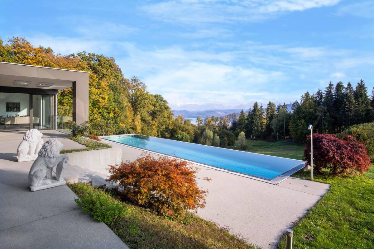 Hier finden Sie die einzigartige Kombination von einer luxuriösen, modernen Designer-Villa in einmaliger Wörthersee Panoramalage auf einem großzügigen, unverbaubarem 6.860 m² großen Grundstück mit gesicherten Erweiterungsmöglichkeiten! Das uneinsehbare Anwesen oberhalb der Nebelgrenze mit einer Wohnfläche von über 800 m² und mit ca. 380 m² Terrassen bietet nicht nur eine großzügige Raumaufteilung mit überdurchschnittlichen Raumhöhen, sondern verfügt auch über ein Heimkino, Weinkeller, Fitnessraum mit Sauna, Werkraum, Atrium mit einem altem Olivenbaum, einen beheizbaren, 17 m langen Infinity-Edelstahlpool, edle Designermöbel, offener Kamin, Personenlift (seniorengerecht) und viel Platz für Familie und Freunde im eigenen Gästetrakt. Auf 680 Höhenmetern lebt man hier entspannt und ruhig abseits des hektischen Treibens vom Hotspot Velden mit einem fantastischen Rundum-Panorama am Waldrand. Sie haben außerdem die Möglichkeit weitere 11.000 m² landwirtschaftliche Flächen günstig zu pachten. In der Umgebung gibt es nur wenige Nachbarn, viel Wald, lange Spazier- und Wanderwege. Während der heißen Sommertage bewähren sich neben der Höhenlage die eingebauten Kühldecken im Wohnbereich und dem Obergeschoß. Die technische Ausstattung ist am neuesten Stand und umfasst neben der üblichen Alarmanlage mit Direktanschluß auch eine Videoüberwachung, die beste IT-Ausstattung, BUS-Systeme und überkomplette Installationen. Diese Architekten-Villa ist ein Garant für privates Wohnen auf höchstem Niveau in Mitten einer intakten Kulturlandschaft.