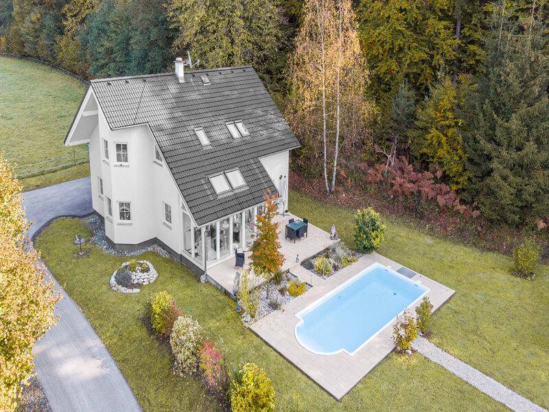Das gepflegte, neuwertige Vario-Einfamilienhaus in absoluter Ruhelage verbindet moderne Elemente mit gemütlichen Akzenten. Eingebettet in einen schönen, von einem bekannten Garten-Architekten gestalteten Garten am Waldrand, finden Sie hier ein angenehmes Heim und genügend Platz auf über 180 m² für Sie und Ihre Liebsten. Das ca. 1.500 m² Grundstück verfügt noch über ein separates Gartenhaus und bietet Raum für viele Gestaltungsideen. Der Eingangsbereich mit einem Gäste-WC führt in einen lichtdurchfluteten, großzügigen Küchen-Wohn-Essbereich. Dieser lädt zu gemeinsamen Essen und zum Relaxen mit der Familie und Freunden vor dem offenen Kamin ein. Vor dem angebauten Wintergarten befindet sich neben einer sonnig gelegenen, großen Terrasse ein schöner 8 m x 4 m Swimmingpool mit römischem Einstieg. Der Blick auf den nahen Wald und in den eigenen Garten schenkt Ihnen auch im Alltag entspannte Stunden. Im Parterre befindet sich noch ein eigenes Büro und ein Abstellraum. Das Obergeschoss erreichen Sie über eine Galerie und Holzstiege. Dort befinden sich 4 separate, helle Zimmer und ein Bad mit WC, Dusche und Badewanne. Für Ihre Kraftfahrzeuge haben Sie genügend Platz in einem geräumigen Doppelcarport, das über eine neu asphaltierte Zufahrt erreichbar ist. Durch die effiziente, umweltschonende Heizung und ohne Keller sind gute Energiekennzahlen erzielbar gewesen.