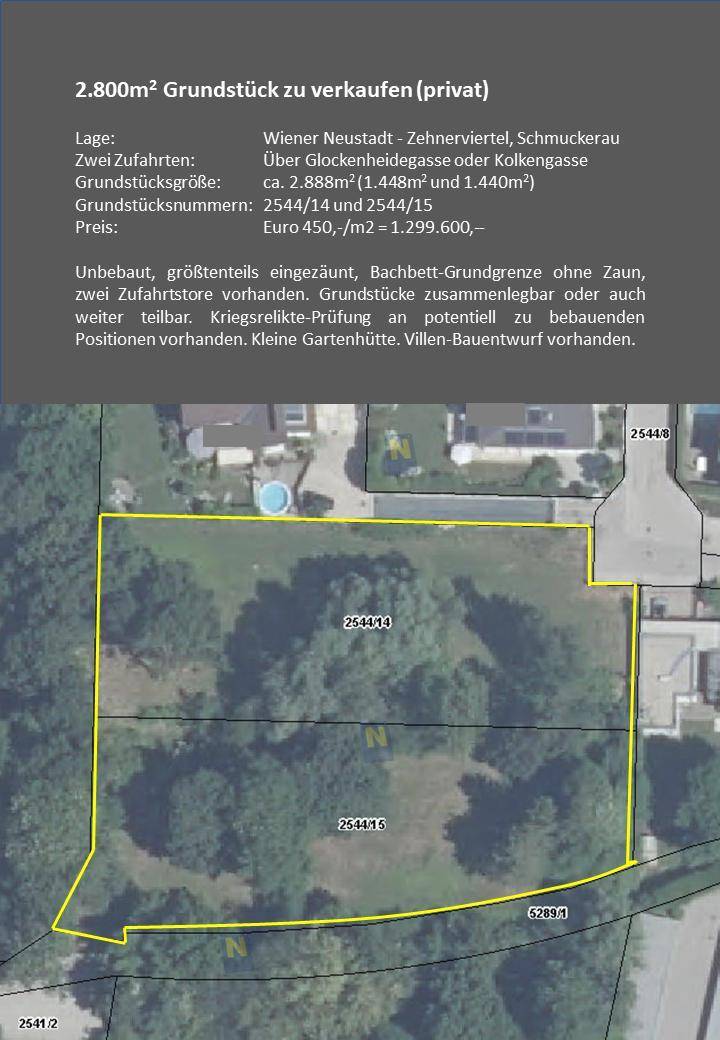 Lage: Wiener Neustadt - Zehnerviertel, Schmuckerau Zwei Zufahrten: Über Glockenheidegasse oder Kolkengasse Grundstücksgröße: ca. 2.888m2 (1.448m2 und 1.440m2) Grundstücksnummern: 2544/14 und 2544/15 Preis: Euro 450,-/m2 = 1.299.600,-- Unbebaut, größtenteils eingezäunt, Bachbett-Grundgrenze ohne Zaun, zwei Zufahrtstore vorhanden. Grundstücke zusammenlegbar oder auch weiter teilbar. Kriegsrelikte-Prüfung an potentiell zu bebauenden Positionen vorhanden. Kleine Gartenhütte. Villen-Bauentwurf vorhanden.