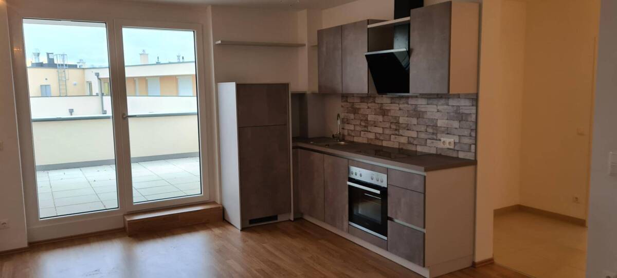 Wunderschöne 2 Zimmer Dachgeschoß Wohnung bestehend aus Vorraum WC Badezimmer mit Badewanne Zimmer mit Nische für begehbaren Schrank Zimmer mit Einbaukücke 25 m² große Dachterrasse Lift Kellerabteil versperrbar Kellerabteil für Fahrräder Gemeinschaftsgarten Bei der Wohnung handelt es sich um einen wunderschönenErstbezug mit sehr guter Raumaufteilung.