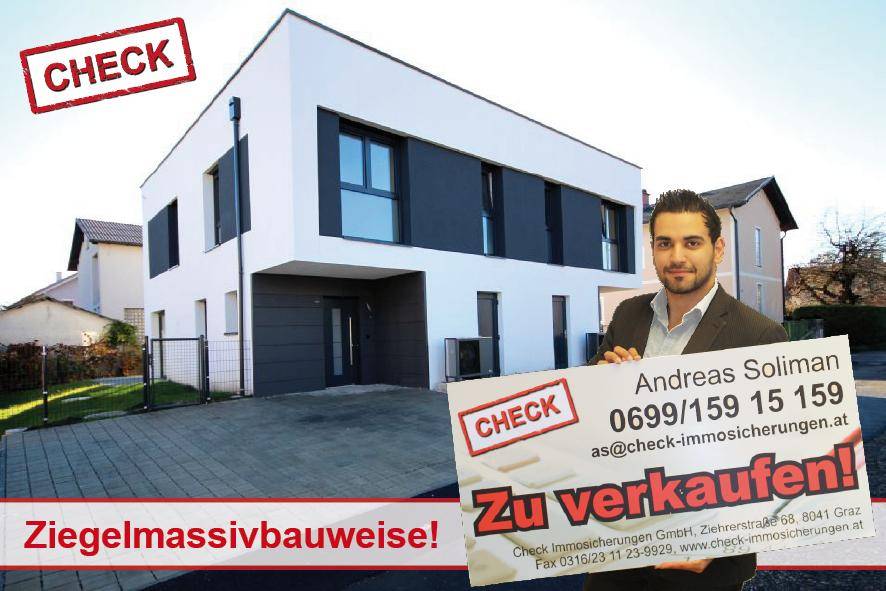 Diese moderne Doppelhauhälfte befindet sich in einer schönen Lage in Graz-Puntigam, nähe SCS. Sie überzeugt durch ihren modernen Stil und die massive Bauweise. Die Doppelhaushälfte verfügt über ca 116 m² Wohnfläche und ist wie folgt aufgeteilt: EG: Vorraum, Bad, WC, AR, großer offener Wohn-/Essbereich mit Küche und Zugang auf die Terrassen sowie den Garten OG: Vorraum, 3 getrennt begehbare Schlafzimmer, Bad, WC Weitere Infos: > Ziegelmassivbau > Niedrigenergie > Begrüntes Flachdach > Fußbodenheizung > Fenster 3fach verglast, elektrische Rollos bzw Raffstore Überzeugen Sie sich selbst von diesem tollen Haus und vereinbaren Sie einen Besichtigungstermin unter 0699/197 800 71 - ich freue mich auf Ihren Anruf! Wir helfen Ihnen auch gerne bei Ihrer Finanzierung weiter und vergleichen unabhängig Banken für Sie! HIER