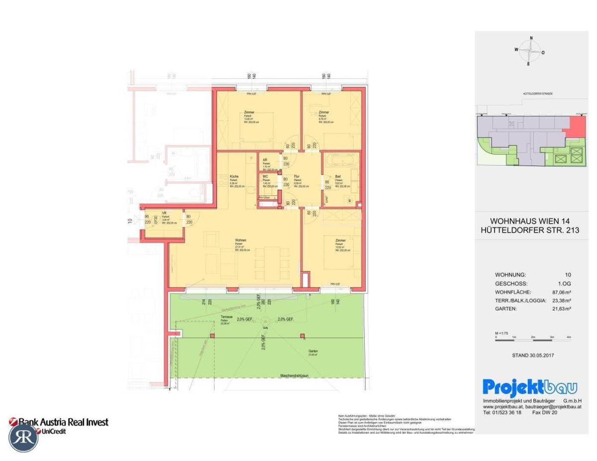 Moderne 4-Zimmer im 1. OG mit Garten und Terrasse, Küche, Bad + WCKüche (Herd mit Dunstabzugshaube, Spüle, Geschirrspüler, Kühlkombination), Bad, WC, Parkettboden, Dreh- und Kippfenster mit Wärmeschutz.Mietdauer: 10 Jahre Kaution: 3 Bruttomonatsmieten Garage: € 110,--/MonatDie neu gebaute, moderne Wohnanlage (Niedrigenergiehaus mit Gaszentralheizung) zeichnet sich v.a. durch ihre attraktive Gestaltung und Infrastruktur aus. Die durchdachte Architektur mit Gärten, Balkonen und Loggias garantiert für alle Mieter ein angenehmes Wohnambiente. Selbstverständlich steht Ihnen eine hauseigene Tiefgarage mit direktem Liftzugang und ein Fahrradraum zur Verfügung.Schicken Sie uns eine Anfrage bzw. kontaktieren uns persönlich unter 01- 40 22 888 - 0.Nach Erhalt Ihrer Anfrage übermitteln wir Ihnen das Angebot und können dann gerne eine Besichtigung vereinbaren.Infrastruktur / EntfernungenGesundheit Arzt <500m Apotheke <500m Krankenhaus <500m Klinik <3.500m Kinder & Schulen Schule <500m Kindergarten <1.000m Universität <2.000m Höhere Schule <2.500m Nahversorgung Supermarkt <500m Bäckerei <500m Einkaufszentrum <2.000m Sonstige Bank <500m Geldautomat <500m Post <500m Polizei <1.000m Verkehr Bus <500m Straßenbahn <500m U-Bahn <1.000m Bahnhof <1.000m Autobahnanschluss <5.000m Angaben Entfernung Luftlinie / Quelle: OpenStreetMap