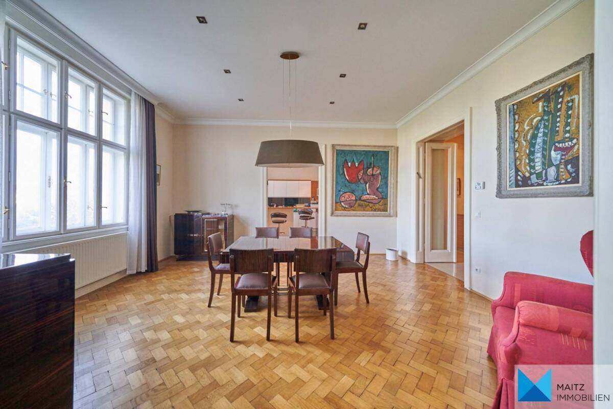 English Description BelowZwischen Krieglergasse und Rotundenbrücke besteht ein geschlossenes Ensemble stattlicher Zinshäuser mit secessionistischen Fassaden, die dem Donaukanal und der Hundertwasser Promenade zugewandt sind. Erbaut 1910, geplant von den Architekten Gebrüder Drexler (Anton und Josef, beide Schüler Theophil von Hansens, welcher für das Parlamentsgebäude, die Wiener Börse und den Wiener Musikverein architektonisch verantwortlich zeichnet). Die Gebrüder Drexler - in der Donaumonarchie zu den produktivsten und herausragendsten Architekten zählend - waren zunächst dem Historismus verhaftet, ab 1910 wendeten sie sich vermehrt secessionistischen Stilelementen zu, wie am gegenständlichen Wohnhaus eindrucksvoll erkennbar. Bereits im Entrée wird man mit Jugendstil-Ornamenten an Wänden und Holztäfelung, Stuck, historischer Glasmaleriei, kupfernen Verzierungen, Supraporten und floraler Glasgravur in der historischen Liftkabine empfangen. Ohne jeglichen Zweifel: Hier war seit jeher das Großbürgertum zuhause. Der Lift startet im Hochparterre, passiert den Mezzanin und hält im 3. Stockwerk (inkl Mezz), wo sich diese 4,5-Zimmerwohnung über 139m² Wohnfläche zuzüglich 1m² hofseitigem Klopfbalkon erstreckt. Ein weiterer Klein-Balkon von ca. 1m² Größe ist der Wohnung straßenseitig zugeordnet, jedoch nicht direkt begehbar. Zwei große Zimmer und die Küche sind ostwärts ausgerichtet und bieten Fernblick. Hier können beeindruckende Sonnenaufgänge bewundert werden. Das Schlafzimmer und das Arbeitszimmer sind hofseitig angelegt und bieten absolute Ruhelage. Die Raumhöhe beträgt 3,15m (wobei hier bereits die abgehängten Decken berücksichtigt sind). Zentral begehbarer Grundriss: # großes Vorzimmer (ca. 16,8m²) mit möblierter Garderobe, reichlich Stauraum und Zugang zum hofseitigen Klopfbalkon # klassische 3 Zimmer in der Reihe, wobei eines zur Küche wurde (Erkerzimmer mit ca. 26m², derzeitiges Speisezimmer ca. 25 m² und Küche ebenfalls ca. 25 m²) # hofseitiges Schlafzimmer (ca. 20m²) und Arbeitszimmer (rund 11m²) # Bad mit Waschtisch samt beleuchtetem Spiegel und Unterbau- und Aufbwahrungsschrank, Wanne mit multicolor LED-Beleuchtung, Regendusche, WC und Fenster Badwände mit Glasmosaikfliesen # Küche in neuwertigem Zustand inkl. sämtlicher Geräte, Waschmaschine mit Trockner und wandintegriertem TV; Bar-Sitzgelegenheit verbleibt # separate Toilette mit Handwaschbecken, Wandverfliesung auf ca. 1,50m und Fenster Auf Wunsch kann das Esszimmer-Mobilar erworben werden.Die gesamte Wohnung wurde im Jahre 2011 sorgsam und detailgenau komplettsaniert; folgende Maßnahmen seien hervorgehoben: + Wasser- und Elektroleitungen erneuert + original Parkettböden aus dem Schloß Schönbrunn in Schlaf- und im Arbeitszimmer + Fenster restauriert + Vorbereitung für offenen Kamin im Wohnzimmer + Home-Automatisation: Lichtsteuerung per Sprachbefehl, Google-Sprachdienst etc... + abgehängte Decken mit Spots in der gesamten Wohnung (teilweise bereits LED) + Wände begradigt + Hifi und TV-Verkabelung in den Wänden; Wand - und Deckenboxen in Küche und Speisezimmer 2-Zonen-Soundsystem und 3 TV-Auslässe in Zimmer, Küche, Schlafzimmer + Einbaumöbel: Garderobe mit Stauraum, Schlafzimmerkästen + Küche mit Sitzgelegenheit; Premiumgeräte von Gorenje + Bad und Toilette komplett erneuert + Gasetagenheizung Vor Sanierung befand sich das Schlafzimmer an Stelle der jetzigen Küche und vice versa. Der Durchgang zwischen Arbeitszimmer und (jetziger) Küche wurde mittels Einbauregal geschlossen.Infrastruktur: Supermarkt, diverse Gastronomie Sophiensäle, Hundertwasserhaus kurze Gehdistanz zum Rochusmarkt mit seinem vielfältigem Angebot Shopping —> Landstraßer Hauptstraße (Galeria, The Mall, Bio-Supermarkt Maran, Rochusmarkt, Joseph’s Brot uvm.) 10-15 Gehminuten in den 1. Bezirk (Stadtpark) 10 Gehminuten fußläufig in den Prater (Jesuitenwiese, Tennisclub, Bowlinghalle, Baseballclub, Prater Hauptallee usw.) 15 Gehminuten zum Schweizerhaus und Wirtschaftsuniversität Wien Öffentliche Verkehrsanbindung: Straßenbahn 1 (Richtung Prater sowie Richtung Schwedenplatz / 1. Bezirk) U3 Rochusgasse U3 / U4 Landstraße-Wien-Mitte Autobus 4A S1, S2, S3, S4, S7 CAT: Zug zum Flughafen Schwechat von Wien Mitte Individualverkehr: + ideale Flughafenanbindung via Lände --> Ostautobahn + via Erdberger Lände im Nu zur Südosttangente und auf die A2 + nach Bratislava ca 40 Min (via Hainburg) Vertrag & Kosten: Kaufpreis & Betriebskosten wie angeführt Derzeit laufen zusätzlich noch folgende Kredite (angeführt werden die monatlichen Kosten, welche auf die gegenständliche Wohnung entfallen): Kredit I (Gas-, Elektro- und Wassersteigleitung) bis 12.2025 € 53,20 Kredit II (Fassade) bis 02.2026 € 37,24 Kredit III (ident) : bis 11.2025 € 109,06 BK allgemein, BK-Lift (jeweils 10% USt.), Rücklage und Kreditraten ergeben aktuell eine monatliche Zahlung iHv. 570,24 brutto. Maklercourtage: 3% vom Kaufpreis (zuzügl. 20% USt.)Auf Wunsch profitieren unsere Kunden von kostengünstigen Konditionen bei der Vertragserrichtung. Bitte sprechen Sie uns darauf an, wenn Ihrerseits Interesse besteht. Wir freuen uns auf Ihre schriftliche Anfrage! Es besteht kein Naheverhältnis zum Abgeber. Sämtliche Informationen und Dokumente zu dieser Immobilie wurden uns vom Abgeber übermittelt; wir vertrauen auf deren Richtigkeit, da keinerlei Grund zum Zweifel aufkam.-------------------------------------------ENGLISHBetween Krieglergasse and Rotundenbrücke there is a closed ensemble of stately apartment buildings with Secessionist facades facing the Danube Canal and Hundertwasser Promenade. Built in 1910, planned by the architects brothers Drexler (Anton and Josef, both students of Theophil von Hansen, who was architecturally responsible for the Parliament Building, the Vienna Stock Exchange and the Vienna Musikverein).The Drexler brothers - who were among the most productive and outstanding architects in the Danube M