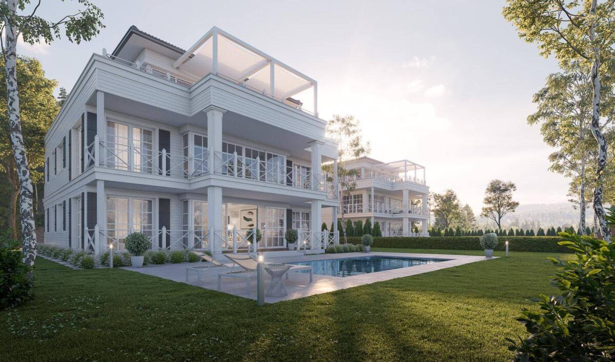 Die Villa „Westhampton“ liegt westlich neben zwei weiteren Villen auf einem parkähnlichen Areal und fasziniert mit einem einzigartigen Panorama-Blick auf den türkisfarbenen Wörthersee und die umliegende Naturlandschaft. Ein angrenzendes Wäldchen und gepflegte Hecken schützen die Villa vor fremden Einblicken und bieten absolute Privatsphäre. Helle Farbtöne wie Weiß, Sand, Beige und warmes Grau sowie große Fenstertüren mit überdachten Terrassen dominieren den Look dieser exzellenten Architektur.