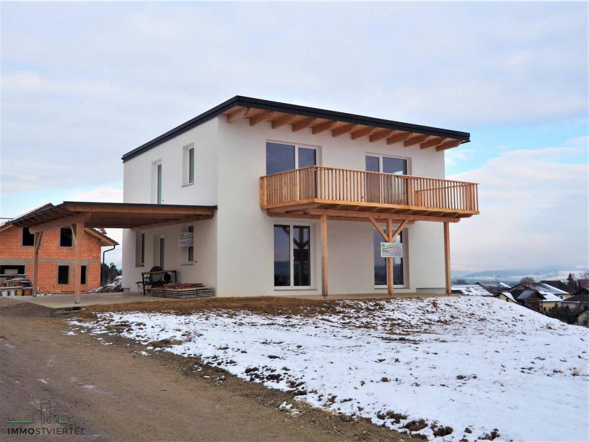 • Erstbezug Neubau in schöner neuer Siedlungslage• Widmung Bauland Wohngebiet - Eckparzelle• Grundfläche: rechnerisch vermessen 822 m²• Ortswasser-Ortskanal angeschlossen• Wohnhaus mit Vollkeller roh ca. 75 m² Nfl. - Eigentümer malt noch die Rohbetonwände weis, und setzt eine Tür beim Abgang in den Keller, extra Auf-Ausgang vom Keller in den Garten• Massivbauweise: 25 cm Ziegel plus 20 cm Vollwärmeschutz• 2 Wohneinheiten wären möglich EG ca. 69 m² Wfl. OG: ca. 71 m²• Wohnfläche im EG: Vorraum Bad mit WC/Dusche/Wanne, offene Wohn-Essküche mit Zugang zur Terrasse mit ca.31 m², 1 Schlafzimmer• Wohnfläche im OG: Bad mit WC/Dusche/Wanne, offene Wohn-Essküche mit Zugang zur Holz-Balkon mit ca. 21 m², 1 Schlafzimmer (1-2 weitere SZ möglich)• Küchenanschlüsse in jeder Etage vorbereitet• Fenster-Balkontüren Kunststoff Internorm 3 Fach Verglasung• Zur freien Gestaltung bzw. Fertigstellung bleibt für die neuen Besitzer z. Bsp.. Gartengestaltung inkl. Einfriedung Terrassenbelag, Keller roh• Laminatböden im Wohnbereich, Fließen in Sanitärräumen und Vorhaus sowie Stiegenaufgänge• Carport für 2 PKW Stellplätze am Haus angebaut Überdachte Fläche ca. 39 m²• Fußbodenheizung im EG und OG, Keller derzeit unbeheizt, Nachrüstung mit Heizkreislauf für Radiatoren möglich. Inbetriebnahme der Heizung erfolgt in den nächsten Wochen.• Baubewilligung vorhanden• Fertigstellungsmeldung in Arbeit samt Bauführerbescheinigung dies wird vom Eigentümer erledigt bis zur Benützungsbewilligung• Diverse Arbeiten zur Fertigstellung sind noch im Gang ( z. Bsp.: Zählerkasten wird gerade fertig installiert, Luftwärmepumpe , Bad - Sanitärmontagen im OG, )• Auf Wunsch kann gegen Aufzahlung eine weitere Terrasse oberhalb des Carport erstellt werden, .....• Übergabe nach VereinbarungInfrastruktur / EntfernungenGesundheit Arzt <1.000m Apotheke <5.500m Klinik <5.500m Kinder & Schulen Schule <5.000m Kindergarten <5.000m Nahversorgung Supermarkt <1.500m Bäckerei <6.500m Sonstige Bank <5.500m Geldautomat <5.500m Post <5.500m Verkehr Bus <500m Autobahnanschluss <9.000m Bahnhof <6.000m Angaben Entfernung Luftlinie / Quelle: OpenStreetMap