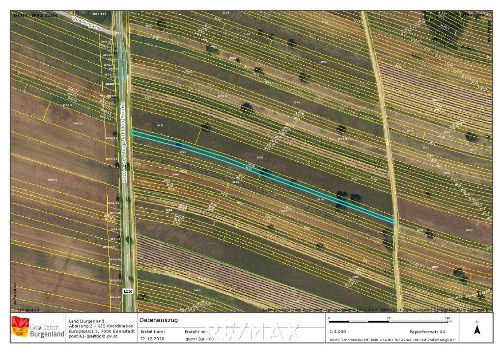 Zum Verkauf gelangt dieser landwirtschaftliche Grund in Oslip. Das Grundstück ist lang gezogen, umringt von weiteren landwirtschaftlichen Nutzflächen. Das Foto zeigt den Katasterplan zur Veranschaulichung der Lage. Die Nutzfläche hat die Grundstücksnr. 2024.