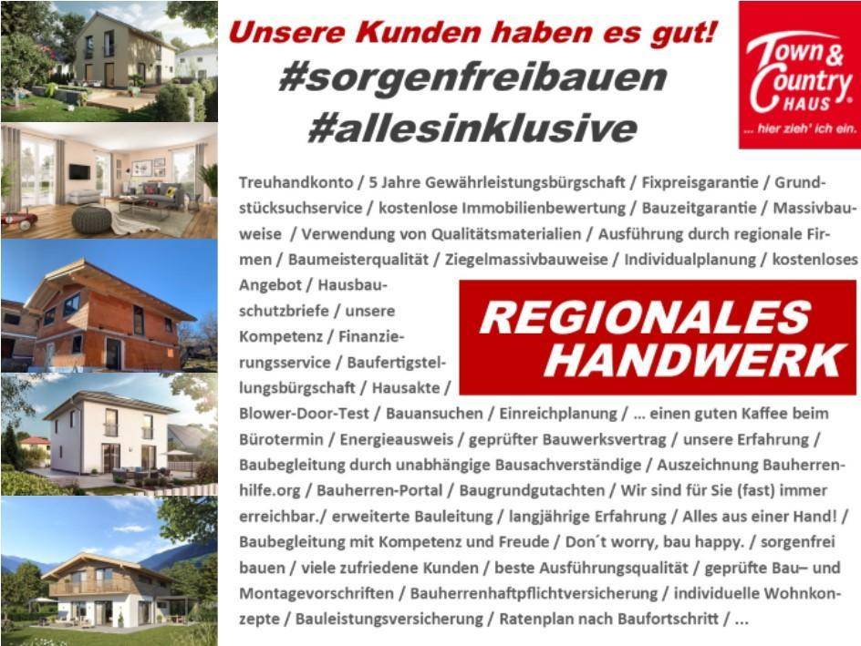 Sie möchten ein hochwertiges Ziegelmassivhaus in bester regionaler Baumeisterqualität bauen? BESCHREIBUNG / AUSSTATTUNG: Ziegelmassivhaus belagsfertig* ca. 120 m² mit Bodenplatte, moderne Wärmepumpe mit Fußbodenheizung, klassische Massivbauweise vom regionalen Baumeister mit rotem Ziegel, Innentreppe betoniert, hochwertige Fenster mit 3-fach-Verglasung, ... Die Raumaufteilung erfolgt im Rahmen der Individualplanung. HINWEIS: Innenmalerarbeiten, Bodenbeläge, Fliesenbeläge und Sanitäreinrichtung Bad und WC sind NICHT inkludiert. Schlüsselfertige Ausführung nach Bemusterung durch den Kunden möglich. UNSERE INKLUDIERTEN LEISTUNGEN: Ziegelmassivbauweise Baugrundgutachten kostengünstige und energiesparende Ausführung inkl. Einreichplanung und Energieausweis Verwendung von Markenprodukten, wie Vaillant, Bramac, Schiedel, ... Fixpreisgarantie, Treuhandabwicklung Qualitätsprüfung durch unabhängige Baugutachter ... Herr Reinhard Bichler begleitet Sie gerne bei Ihrem Traumhausprojekt. Tel.: 0664 88520774 Email: reinhard.bichler@towncountry.at Der angeführte Preis gilt für die Hauserrichtung OHNE Grundstück exkl. Nebenkosten (Kaufnebenkosten Grundstück, Erschließung, Anschlussgebühren, sonstige Abgaben, ...). Änderungen - Irrtum - Verfügbarkeit vorbehalten Fotos und Pläne können kostenpflichtige Sonderwünsche beinhalten. Grundstückskauf und Hauskauf sind getrennte Rechtsgeschäfte.