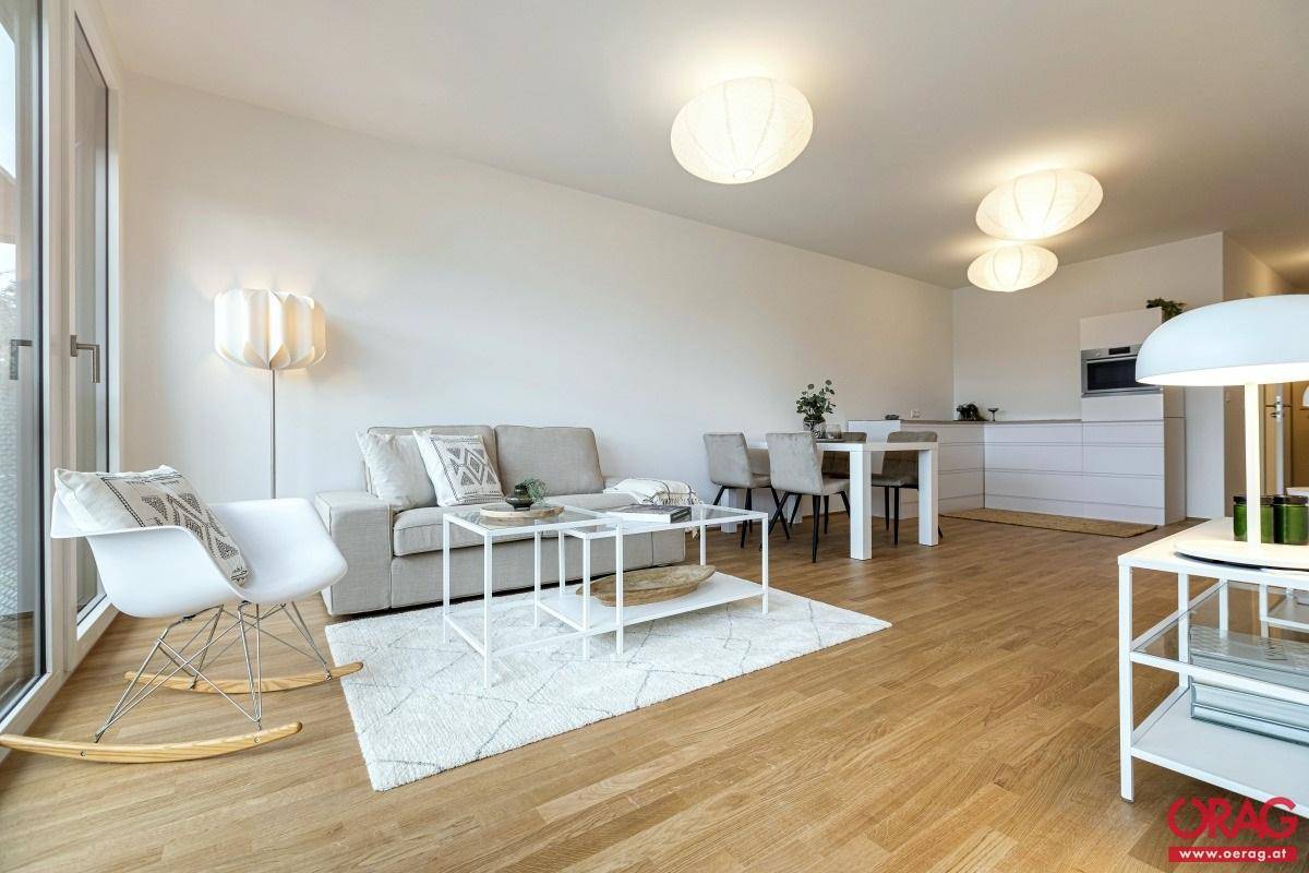 ESCHENGARTEN - Wohnen, natürlich in Liesing Zwei Häuser in Liesing fügen sich zu einem einzigartigen Wohnensemble. Wo Wohnen und Natur zusammentreffen, ist das Leben modern. Willkommen in Haus Ahorn und Haus Esche. In Liesing entsteht ein exklusives Wohnprojekt mit 92 freifinanzierten Eigentumswohnungen mit Größen von ca. 35 bis 118 m² verbunden über eine großzügige Grünanlage – dem Eschengarten. Die Esche gilt als Stadtbaum der Zukunft, sie liebt die Sonne und dient als perfekter Schattenspender in der warmen Jahreszeit. Architektur, Ökologie und hochwertiges Design prägen den Charakter des Wohnprojektes, so dass ein einzigartiger Eigenheim-Wohlfühlfaktor entstehen kann. Die Wohnung Top 2.22 erstreckt sich über eine Wohnfläche von ca. 47 m² sowie einem ca. 6 m² großen Balkon und weist folgende Raumaufteilung auf: - Vorraum (ca. 6 m²) - Wohnküche (ca. 19 m²) - Zimmer (ca. 10 m²) - Badezimmer (ca. 5 m²) - WC (ca. 1 m²) - Schrankraum (ca. 4 m²) - Abstellraum (ca. 2 m²) - Balkon (ca. 6 m²) Die Wohnung kann ebenso als Vorsorgewohnung erworben werden. Highlights: - funktionale Raumkonzepte - durchdachte Grundrisse - Freiflächen in Form von Loggien, Balkonen, Terrassen und Gärten - hauseigener Mehrzweck-/ Fitnessraum - großzügige Fensterflächen bieten viel natürliches Licht - der Eschengarten mit seiner vielfältigen Bepflanzung - Tiefgarage mit 81 Stellplätzen. Ein Stellplatz kann um € 24.000,00 erworben werden. Ausstattung: Beide Wohnhäuser punkten mit einer formschönen und erstklassigen Ausstattung. Naturholz verleiht den lichtdurchfluteten Wohnräumen eine bodenständige Note – deswegen sind hochwertige Echtholz-Parkettböden bei Haus Ahorn und Haus Esche Standard. Großzügige Fenster mit 3-fach-Isolierverglasung holen die Natur ins Haus – erholsam und nachhaltig zugleich. Rollläden im Erdgeschoß und teilweise Screen-Rollos in den oberen Geschoßen bieten sowohl hervorragenden Sichtschutz von außen als auch genug Tageslicht für eine natürliche Raumatmosphäre. Die modernen Bäder überzeugen mit einer hochwertigen Sanitärausstattung und flächenbündigen Spiegeln. Lage: Der Wiener Bezirk Liesing verfügt über eine ausgezeichnete Infrastruktur zur täglichen Versorgung und ist zugleich ein Geheimtipp für Familien: Mehrere Kindergärten, Schulen und zahlreiche Geschäfte sind fußläufig erreichbar. In der Shopping City Süd, nur wenige Autominuten entfernt, finden Sie das österreichweit größte Angebot an Shops, Entertainment und Gastronomie unter einem Dach. Gleich ums Eck liegt die Badner Bahn, die Sie in weniger als 30 Minuten ins Herz der Stadt bringt. Mit der U6 gelangen Sie direkt zum Westbahnhof, eine der wichtigsten Verkehrsdrehscheiben der Stadt. Nur fünf Minuten dauert die Fahrt mit dem Auto zum Badeparadies “100tage sommer”. Rund um den natürlichen Schwimmteich gibt es zahlreiche Möglichkeiten, die Freizeit ausgiebig zu genießen. Ein Projekt von ARE und areos. Visualisierungen: ©JAMJAM Fotos: ©MarkusSchiederPhotography Geplanter Termin Fertigstellung: Frühsommer 2021 Kontaktlose Objektbesprechungen: Wir führen Ihren Beratungstermin völlig kontaktlos und unter Einhaltung aller Vorsichtsmaßnahmen mit Ihnen durch. Auf Wunsch können wir auch Beratungstermine virtuell mit Ihnen durchführen, d.h. wir schicken Ihnen Fotos und Pläne, die wir gemeinsam im Rahmen eines Telefonats präsentieren und besprechen können. Weitere Immobilien finden Sie auf unserer Website www.oerag.at oder in der ÖRAG Immobilien App (iOS & Android).