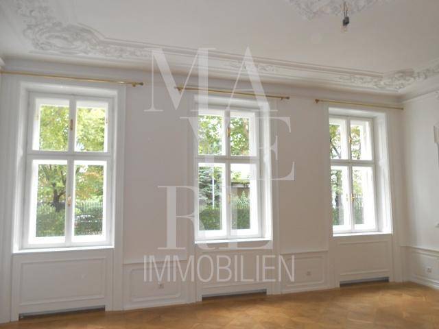 aufwendig renovierte Altbauwohnung - sehr repräsentatives Haus im Botschaftsviertel RAUMAUFTEILUNG: Vorraum, Gäste WC, Wohnküche, Esszimmer, Salon, Masterbedroom mit Garderobe und Badezimmer (Wanne, Dusche, Bidet, WC) ensuite, 1 Schlafzimmer, 1 Gäste/Arbeitszimmer, 1 weiteres Badezmmer mit Wanne, Dusche, Bidet und WC, 1 Abstellraum AUSSTATTUNG: Lift, Parkett und Steinböden, Gasetagenheizung, Stuckdecken, Spots, Fussbodenheizung, teilweise klimatisiert Garagenplätze können in der Nähe angemietet werden befristete Mietdauer (4-5 Jahre) ** ---------- ** newly renovated very classic style apartment in very representative builing entrance hall, guest toilet, spacious kitchen with dining corner, dining room, living room, masterbedroom with wardrobee and bathroom (tub, shower, toilet, bidet) ensuite , 1 big bedroom, 1 smaller room (guest/study/kids), second bathroom (tub, shower, toilet, bidet), storage room wooden and stone floors, floorheating, stucko ceilings, spotlights, floorheating, partly air conditioned garag places to rent nearby limited lease (4-5 years)Angaben gemäß gesetzlichem Erfordernis: Miete € 3000 zzgl 10% USt. Betriebskosten € 527,27 zzgl 10% USt. Umsatzsteuer € 352,73 ------------------------------------------------------------------ Gesamtbetrag € 3880