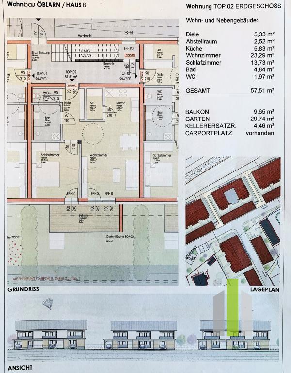 Erdgeschoss-Wohnung mit Gartenanteil In Öblarn trifft Natur auf moderne Wohnqualität. Das Neubauprojekt mit insgesamt 5 Häusern liegt in der Tauernregion nahe der Enns. Alle Pisten-Highlights der 4-Berge-Schischaukel Schladming-Dachstein sind in 20 bis 30min Minuten mit dem Auto erreichbar. Ob Bergsteigen, Klettern, Mountain-Biken, Gleitschirmfliegen, Rafting oder Golf...auch im Sommer bieten sich hier viele Möglichkeiten. Die Bezirkshauptstadt Liezen ist in 20 min zu erreichen. Der Imposante Berg Grimming thront prominent gegenüber, das weltberühmte Flair des Ennstals ist allgegenwärtig. Die Wohnungen in Öblarn sind eine echte Rarität - sie bieten die seltene Gelegenheit zur Errichtung eines ZWEITWOHNSITZES in dieser Gegend. Die jeweils 6 pro Wohneinheit angebotenen Wohnungen sind für die Eigennutzung und als attraktive Anlageobjekte mit Wertsteigerungspotenzial geeignet. Angeboten werden jeweils 3 Wohnungen im Erdgeschoss mit Balkon und kleinem eigenen Garten und 3 Wohnungen im Obergeschoss mit einem Balkon. Der Baubeginn ist erfolgt. HIGHLIGHTS - Modernes Wohnen - ZWEITWOHNSITZFÄHIG - Wohnungsgrößen von 57-83 m2 - Blick auf den Grimming und die umliegende Berglandschaft - hochwertige Bauweise und gehobene Ausstattung - 3fach verglaste Fenster - Fußbodenheizung in allen Räumen - Parken im eignen Carport mit verschließbarem Abstellraum - Energieeffizientes Wohnen (HWB 40,0) Die hier beschriebene Wohnung HAUS B Top 02 ges. 57,51m² Wohnfläche befindet sich im Erdgeschoss und bietet Ihnen - Küche 5,83m² mit Parkett - Wohnzimmer 23,29m² mit Parkett und Zugang zum - Balkon 9,65m² mit Holzdielen ausgelegt - Garten 29,74m² - 1 Schlafzimmer 13,73m² mit Parkett ausgelegt - Badezimmer 4,84m² mit Fliesen ausgelegt - Separates WC 1,94 m² mit Fliesen ausgelegt - Eine Diele 5,33m² mit Parkett ausgelegt - Abstellraum 2,52m² mit Parkett ausgelegt KAUFPREIS: €189.280,- PROVISION: 3% plus 20%MWST Mit jeder Wohnung ist ein Carportabstellplatz und Abstellraum mit Licht und Stromanschluss verbunden (obligatorisch); Zusatzkosten: Carportabstellplatz: EUR 12.840,00 Abstellraum: EUR 3.870,00 Sollten Sie mehr als 1 Abstellplatz benötigen, stehen begrenzt Abstellplätze im Freien ebenfalls zum Verkauf: Pkw-Abstellplatz im Freien: EUR 6.260,00 Da aufgrund der aktuellen Situation Besichtigungen der Baustelle nur eingeschränkt möglich sind , bieten wir Ihnen gerne eine VIDEO-BESICHTIGUNG an, damit Sie sich trotzdem ein besseres Bild von der Lage der geplanten Immobilie machen können. Vereinbaren Sie gleich einen Termin! INFORMATION, BERATUNG & VERKAUF Informieren Sie sich jetzt über das komplette Wohnungsangebot und fordern Sie unverbindlich Exposé, Grundrisse und Preise bei mir an: Aufgrund ständiger Geschäftsbeziehung zum Abgeber, weisen wir auf ein wirtschaftliches Naheverhältnis hin. Bettina Bizien - Poetsch-Immobilien GmbH, 5020 Salzburg Tel.No.: +43 (0)664/88541417 Email: b.bizien@poetsch-immo.at Warten Sie nicht lange und sichern Sie sich gleich eine dieser schönen Wohnungen mit ZWEITWOHNSITZ-Widmung und wirken noch mit bei der Verwirklichung Ihres Wohntraumes im Ennstal.Angaben gemäß gesetzlichem Erfordernis: Heizwärmebedarf:40.0 kWh/(m²a)Klasse Heizwärmebedarf:BFaktor Gesamtenergieeffizienz:0.64Klasse Faktor Gesamtenergieeffizienz:A+