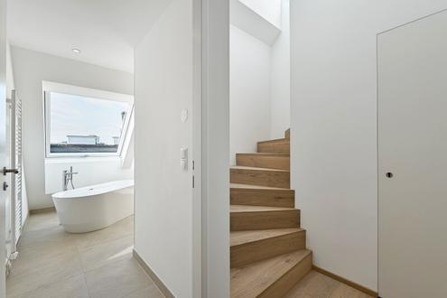 Maisonette Dachgeschosswohnung Die Top 72 erstreckt sich vom 1. in das 2. Dachgeschoss und verfügt über eine Wohnfläche von rund 129 m² sowie einer Terrasse im 2.DG mit rund 28 m². Auf der unteren Ebene befindet sich der Wohnungseingang, ein Vorraum, eine Toilette mit Handwaschbecken, ein Bad mit Badewanne, Doppelwaschbecken, Waschmaschinenanschluss und Dachflächenfenster sowie 2 Zimmer. Über eine Treppe gelangen Sie in die rund 45 m² große Wohnküche, von wo aus Sie über ein großes Hebeschiebefenster die rund 28 m² große Terrasse mit herrlichem Blick über die Stadt. Auf dieser Ebene befindet sich auch ein weiteres Schlafzimmer (Master Bedroom). Das en suite Badezimmer mit Dachflächenfenster rundet den privaten Bereich ab. Ein weiteres Highlight ist in der Wohnküche eine fast vollständig verglaste Wand die den schönen Ausblick in den begrünten ruhigen Innenhof noch näher in die Wohnung hereinholt. An heißen Tagen kühlt bei Bedarf eine Klimaanlage die Aufenthaltsräume. Im Winter überzeugt die behagliche Fußbodenheizung. Die Fertigstellung wird voraussichtlich im Q4 2024 erfolgen. ERSTKLASSIGE AUSSTATTUNG Eichenparkettboden aus Österreich in Dielenoptik Großformatige Fliesen in Sanitärbereichen Markensanitärprodukte Außenliegender elektrischer Sonnenschutz Klimaanlage als Splitgerät Paketboxenanlage kombiniert mit Brieffach Videogegensprechanlage Smarte Hausverwaltungsapp puck Markisenbefestigung auf der Terrasse optional möglich Wasser- und Stromanschluss auf der Terrasse (eine Außenleuchte ist ebenfalls inkludiert) Doppelwaschbecken, Badewanne und Dusche 2 Toiletten Waschmaschinenanschluss Wohnungseingangstür Widerstandsklasse 3 (RC 3) VERTRAGSERRICHTUNG Mit der Wohnungseigentumsbegründung, Kaufvertragserrichtung, treuhändigen Abwicklung und grundbücherlichen Durchführung ist die Rechtsanwaltskanzlei Tiefenthaler Gnesda, in 1010 Wien, Rockgasse 6/6 beauftragt. Die Kosten für die angeführten Dienstleistungen belaufen sich auf 1,5% zzgl. Umsatzsteuer. Hinzu kommen die Beglaubigungskosten für die Unterschriften. Dieses Objekt wird Ihnen unverbindlich und freibleibend zum Kauf angeboten. Oben angeführte Angaben basieren auf Informationen und Unterlagen des Eigentümers und sind unsererseits ohne Gewähr. Als Vermittlungshonorar gelten die allgemeinen Geschäftsbedingungen und die Verordnung für Immobilienmakler des BM für Handel, Gewerbe und Industrie, BGBL. 297/1996. Für den Fall, dass es diesbezüglich zu einem entsprechenden Rechtsgeschäft kommt, verrechnen wir Ihnen eine Vermittlungsprovision von 3 Prozent der Kaufsumme zuzüglich der gesetzlichen Mehrwertsteuer. Wir möchten noch darauf hinweisen, dass wir in einem wirtschaftlichen Naheverhältnis zur Verkäuferin stehen. Wir weisen darauf hin, dass zwischen dem Vermittler und dem zu vermittelnden Dritten ein familiäres oder wirtschaftliches Naheverhältnis besteht. Der Vermittler ist als Doppelmakler tätig.Infrastruktur / EntfernungenGesundheitArzt