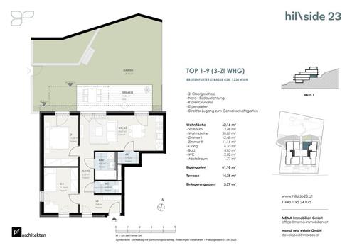 Zum Verkauf steht eine ca. 62 m² große 3-Zimmer-Gartenwohnung in einem Ende 2027 fertig werdenden Neubau. Die Wohnung befindet sich im 2. Obergeschoss. Die Wohnung blickt in den Erlebnisgarten Richtung Norden. Zwischen den Maurer Weinbergen und dem Liesinger Bach entsteht dieses traumhafte Wohnprojekt mit zwei Wohnhäusern. In der Anlage gelangen insgesamt 28 freifinanzierte Eigentumswohnungen, die 1 bis 5 Zimmer und Wohnflächen von 50 bis 145 m² bieten. Zu allen Wohnungen gehört entweder ein Balkon, eine Terrasse oder sogar ein Eigengarten. In der hauseigenen Tiefgarage stehen 21 Kfz-Stellplätze davon 8 Komfortdoppelparker zur Verfügung. Die Kombination aus praktischer Fußbodenheizung und -kühlung sowie Markenparkettböden (Eiche) bietet optimalen Komfort und ein angenehmes Wohngefühl. Die teilweise bodentiefen Holz-Alu-Fenster sind sowohl mit 3-fach-Isolierverglasung als auch mit außenliegenden Alu-Raffstores ausgestattet. Die Nassräume sind mit großformatigen Fliesen oder Feinsteinzeug versehen. Die Badezimmer verfügen über Duschen oder Badewannen sowie einen Waschmaschinenanschluss. In den Dachgeschosswohnungen werden Split-Klimaanlagen installiert. Die Beheizung und Warmwasseraufbereitung erfolgt mittels energieeffizienter mittels Luft-Wärmepumpe und wird durch eine Photovoltaikanlage unterstützt. Zu jeder Wohnung ist ein eigenes Kellerabteil zugehörig. Die Küche ist im Kaufpreis nicht enthalten. Den Bewohnern steht eine großzügige Gartenanlage als Ruheoase und Raum für gemeinsame Aktivitäten zur Verfügung. Alle wichtigen Einrichtungen und Geschäfte des täglichen Bedarfs sind nur wenige Gehminuten entfernt. Über den Gartenausgang in die Arabellagasse erreichen Sie das Einkaufszentrum Riverside und das Zentrum von Mauer in kurzer Zeit. Die grüne Umgebung bietet eine einzigartige Kombination aus Natur und urbanem Komfort. Infrastruktur: Billa - 12 Gehminuten entfernt Spar - 12 Gehminuten entfernt Turmöl - 7 Gehminuten entfernt Hausarzt - 5 Gehminuten entfernt Apotheke - 12 Gehminuten entfernt Einkaufszentrum (Riverside) - 15 Gehminuten entfernt Öffentliche Anbindungen: Straßenbahn: 60 - Breitenfurter Str./Liesingbrücke (5 Gehminuten) Bus: 253, 259 Wien Rodaunbrücke (Breitenfurter Straße) (4 Gehminuten) Die 62,16 m²-Wohnfläche bietet wie folgt: - Vorraum - Wohnküche - 2 Schlafzimmer - Badezimmer mit Wanne und Waschmaschinenanschluss - separates WC samt Handwaschbecken - Abstellraum - Terrasse: 14,35 m² - Garten: 61,10 m² Werte laut Energieausweis: - HWBREF, SK: 34,5 kWh/m²a (Energieklasse B), - fGEE, SK: 0,69 (Energieklasse A+). - Gültig bis: 31.07.2033 Ab 30% Eigenkapital bieten wir Kreditmöglichkeiten an! Für weitere Informationen sowie Besichtigungen steht Ihnen Christopher Martin unter +43 664 38 300 48 oder office@nagyimmobilien.at zur Verfügung!Infrastruktur / EntfernungenGesundheitArzt