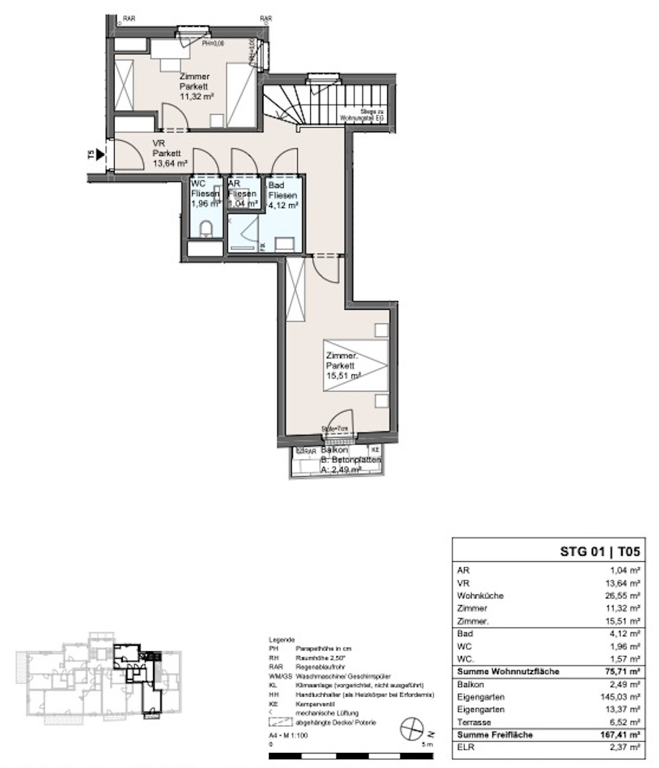 Top 05 | 3 Zimmer | ca. 76 ?m² + ca. 167 m² Außenfläche Die Gartenwohnung bietet ca. 76?m² Wohnfläche verteilt auf zwei Ebenen, eine ca. 7?m² große Terrasse mit anschließendem Eigengarten (ca. 158 m²) sowie einen Balkon im oberen Bereich. Die Wohnküche liegt im Erdgeschoß mit direktem Zugang zur Freifläche. Zwei der drei Zimmer befinden sich im ruhig gelegenen Obergeschoss. Raumaufteilung: Erdgeschoß: Wohnküche: ca. 26,55?m² WC: ca. 1,57 ?m² Terrasse: ca. 6,52 ?m² Eigengarten: ca. 158,40?m² Obergeschoß: Vorraum: ca. 13,64?m² Zimmer: ca. 11,32?m² Zimmer: ca. 15,51m² Bad: ca. 4,12?m² WC: ca. 1,96?m² Balkon: ca. 2,49?m² Abstellraum: ca. 1,04 m² Ein Kellerabteil mit ca. 2,37?m² ist der Wohnung zugeordnet. Besonders hervorzuheben: Der Bau hat bereits begonnen ? das ermöglicht Ihnen als Käufer, gemeinsam mit dem Architekten individuelle Anpassungen in der Raumgestaltung vorzunehmen und Ihre persönlichen Wohnideen zu verwirklichen (solange es noch möglich ist). Die Architektur ist klar und zeitgemäß, das Wohnkonzept auf langfristige Qualität ausgerichtet: Alle Wohnungen sind barrierefrei zugänglich. Beheizt wird mittels Luft/Wasser-Wärmepumpe , ergänzt durch eine Photovoltaikanlage zur Unterstützung des Allgemeinstroms. Eine Tiefgarage mit gesamt 19 Stellplätzen , steht Ihnen zur Verfügung. Technische Ausstattung & Komfort: Wärmepumpe Photovoltaik/Solaranlage zur Reduktion von Energie- und Betriebskosten Fußbodenheizung mit Raumthermostaten Fußbodentemperierung in sämtlichen Zimmern Hochwertige Innenausstattung (Eichenparkett, Feinsteinfliesen u.v.m.) 3?fach verglaste Kunststoff?Alu?Fenster und Sonnenschutz in allen Wohnungen (Rollladen, Raffstores, Markisoletten) Kleinkinderspielplatz auf Eigengrund Kaufpreis: Der Verkaufspreis beläuft sich auf Euro 575.000.- Diese Wohnung kann auch als Vorsorge- / Anlagewohnung mit Umsatzsteuerausweisung (weitere Vermietung verpflichtend!) erworben werden: Anlegerpreis: Euro 518.018,02.- (zzgl. 20% Ust). Alle Preise verstehen sich ohne Kücheneinrichtung und Tiefgaragenstellplatz ( á ? 32.256.- bzw. 29.059,46.- Netto + USt) , in schlüsselfertiger Ausführung! Was überzeugt? Ein klar strukturiertes Konzept, intelligente Grundrisse und eine Lage mit Lebensqualität. Egal ob zur Kapitalanlage oder für den Eigenbedarf ? Mit diesem Wohnbauprojekt investieren Sie in Lebensqualität und Substanz! Immobilien gelten als wertbeständige und sichere Anlageform. Alle Wohnungen und Stellplätze können auch als Vorsorge- / Anlagewohnung mit Umsatzsteuerausweisung (weitere Vermietung verpflichtend!) erworben werden! Sichern Sie sich Ihre neue Vorsorgewohnung - gerne beraten wir Sie dazu! Infina, Österreichs beliebtester Wohnbau-Finanz-Experte, begleitet Sie ganzheitlich rund um Ihr Immobilienvorhaben. Unser Team von Immobilienexperten unterstützt Sie beim geplanten Kauf als auch bei einem möglichen Verkauf Ihrer bestehenden Immobilie. Zudem bieten unsere Finanzierungsexperten auf Wunsch maßgeschneiderte Finanzierungslösungen durch den Vergleich der besten Kredite von über 120 Banken in Österreich und Deutschland. Wir möchten Sie unabhängig, transparent und flexibel als starker Partner in allen Immobilienangelegenheiten unterstützen. Kontaktieren Sie uns für einen persönlichen Besichtigungstermin oder eine unverbindliche und kostenfreie Finanzierungsberatung. Was kann Infina noch für Sie tun? Wenn Sie eine Finanzierung für Ihre Traumimmobilie wünschen, begleiten wir Sie gerne von der strategischen Planung bis zur Realisierung und darüber hinaus. Wir sind Österreichs beliebtester Wohnbau-Finanz-Experte und unsere Mission lautet: Jeder Kunde hat das Recht auf den besten Kredit. Infina kooperiert mit über 120 Banken in Österreich und Deutschland Über 600 Kreditprodukte im Vergleich Über 100-mal vor Ort in ganz Österreich Ebenso unterstützen wir unsere Kunden beim Verkauf und der Vermietung Ihrer Immobilien sowie bei der Immobiliensuche durch unsere Immobilienexperten. Wir weisen Sie darauf hin, dass die gemachten Angaben und Informationen lediglich unverbindliche Vorabinformationen sind und daher ohne Gewähr erfolgen. Der Vermittler ist als Doppelmakler tätig. In der Nähe der großflächigen Grünzone der Schwarzlackenau entsteht ein exklusives Neubau-Wohnprojekt in ruhiger, naturnaher Umgebung Dieses Projekt ist für alle, die Natur und Freizeit direkt vor der Haustür schätzen. Naherholung am Wasser: Nur wenige Minuten bis zur Donauinsel, Neuen und Alten Donau ? perfekte Bedingungen für Sport, Entspannung und Naturgenuss Erholung & Freizeitsport: Schwimmen, Fischen, Segeln, Radfahren und Joggen ? alles schnell erreichbar. Nahversorger: -Eurospar: ca. 750m -Billa: ca. 800m Öffentliche Verkehrsmittel: -Bahnhof Wien Floridsdorf (U6, S1, S2, S3, S4, S7, Regionalzüge): -Ist der wichtigste Verkehrsknotenpunkt im Bezirk. Mit den Buslinien 30A oder 31A erreicht man den Bahnhof in ca. 10?15 Minuten. S-Bahn-Station Strebersdorf (S3, S4): -Diese Station ist mit der Buslinie 32A gut erreichbar. Barrierefrei: JA
