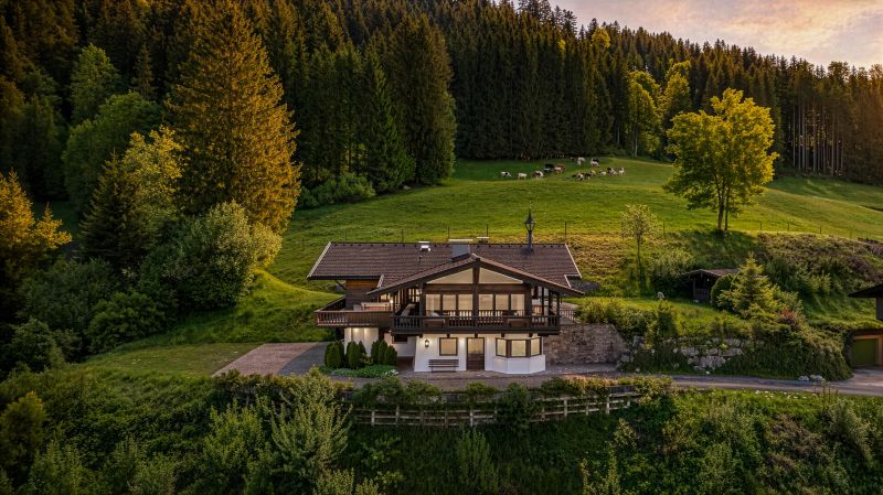 Ein solches Refugium, noch dazu mit seltener FREIZEITWOHNSITZWIDMUNG, ist selbst am Kitzbüheler Immobilienmarkt eine absolute Seltenheit. Das Anwesen auf 1.807 m² Grund thront auf einer leichten Anhöhe, mitten im Freiland und bietet daher einen unverbaubaren Ausblick auf den Astberg sowie den Wilden Kaiser. In unmittelbarer Nähe befindet sich nur ein einziges kleines Nachbarhaus (nicht ständig bewohnt), sodass man eigentlich von einer Alleinlage sprechen kann. Das Landhaus ist Richtung Süd-West und Nord (Kaiser) ausgerichtet und bietet von frühmorgens bis abends Sonne. Es besticht durch sehr viel schöne und hochwertige Altholzeinbauten, welche ein äußerst angenehmes Wohlfühlambiente vermitteln. Über eine private repräsentative Auffahrt gelangt man auf den großen Vorplatz, dort stehen 4 Parkplätze im Freien, ein Carportstellplatz sowie ein Garagenstellplatz zur Verfügung. Aufgrund der leichten Hanglage betritt man das Haus im Erdgeschoss und gelangt in die geräumige Diele. In diesem Geschoss befindet sich ein Wellnessbereich mit Sauna, Whirlpool, Tauchbecken, Dusche, WC und Ruheraum, ein Gästeschlafzimmer mit Bad en suite sowie ein gemütliches "Stüberl" mit Küche, Kachelofen und Essbereich sowie Ausgang auf eine Terrasse. Weiters ist ein Kellerraum, der Heiz- und Technikraum und die Garage auf dieser Ebene. Im Dachgeschoss befindet sich ein riesiger Wohnraum mit zahlreichen Fenstern, welche den Blick auf die umliegende Bergwelt und vor allem auf den Wilden Kaiser freigeben. Ein offener Kamin und ein Kachelofen sorgen für ein angenehmes Klima. Die große Küche ist mit allen Geräten komplett ausgestattet. Angrenzend befindet sich ein schöner großer Esserker. Von dem unglaublich großen, umlaufendem Balkon und einer Balkonterrasse gelangt man weiters in den Garten mit kleinem Gartenhaus. Das Haus ist in sehr gutem Zustand und aufgrund der Lage, des Ausblickes und der Grundgröße, aber vor allem wegen des FREIZEITWOHNSITZES, ist der Preis mehr als angemessen. Energiedaten in Arbeit. Sofort verfügbar.Kabel/SAT/TV: JAProvision: 3,0 %