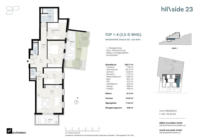 Zum Verkauf steht eine ca. 101 m² große Gartenwohnung mit 3,5 Zimmer in einem Ende 2027 fertig werdenden Neubau. Die Wohnung befindet sich im 1. Obergeschoss. Die Wohnung blickt in die Breitenfurter Strasse Richtung Südosten. Zwischen den Maurer Weinbergen und dem Liesinger Bach entsteht dieses traumhafte Wohnprojekt mit zwei Wohnhäusern. In der Anlage gelangen insgesamt 28 freifinanzierte Eigentumswohnungen, die 1 bis 5 Zimmer und Wohnflächen von 50 bis 145 m² bieten. Zu allen Wohnungen gehört entweder ein Balkon, eine Terrasse oder sogar ein Eigengarten. In der hauseigenen Tiefgarage stehen 21 Kfz-Stellplätze ? davon 8 Komfortdoppelparker ? zur Verfügung. Die Kombination aus praktischer Fußbodenheizung und -kühlung sowie Markenparkettböden (Eiche) bietet optimalen Komfort und ein angenehmes Wohngefühl. Die teilweise bodentiefen Holz-Alu-Fenster sind sowohl mit 3-fach-Isolierverglasung als auch mit außenliegenden Alu-Raffstores ausgestattet. Die Nassräume sind mit großformatigen Fliesen oder Feinsteinzeug versehen. Die Badezimmer verfügen über Duschen oder Badewannen sowie einen Waschmaschinenanschluss. In den Dachgeschosswohnungen werden Split-Klimaanlagen installiert. Die Beheizung und Warmwasseraufbereitung erfolgt mittels energieeffizienter mittels Luft-Wärmepumpe und wird durch eine Photovoltaikanlage unterstützt. Zu jeder Wohnung ist ein eigenes Kellerabteil zugehörig. Die Küche ist im Kaufpreis nicht enthalten. Den Bewohnern steht eine großzügige Gartenanlage als Ruheoase und Raum für gemeinsame Aktivitäten zur Verfügung. Alle wichtigen Einrichtungen und Geschäfte des täglichen Bedarfs sind nur wenige Gehminuten entfernt. Über den Gartenausgang in die Arabellagasse erreichen Sie das Einkaufszentrum Riverside und das Zentrum von Mauer in kurzer Zeit. Die grüne Umgebung bietet eine einzigartige Kombination aus Natur und urbanem Komfort. Infrastruktur: Billa - 12 Gehminuten entfernt Spar - 12 Gehminuten entfernt Turmöl - 7 Gehminuten entfernt Hausarzt - 5 Gehminuten entfernt Apotheke - 12 Gehminuten entfernt Einkaufszentrum (Riverside) - 15 Gehminuten entfernt Öffentliche Anbindungen: Straßenbahn: 60 - Breitenfurter Str./Liesingbrücke (5 Gehminuten) Bus: 253, 259 ? Wien Rodaunbrücke (Breitenfurter Straße) (4 Gehminuten) Die 100,77 m²-Wohnfläche bietet w