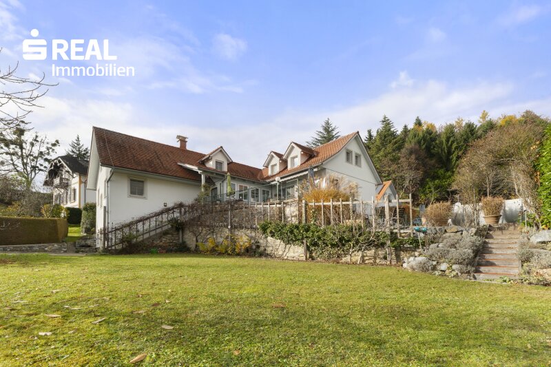 Zum Verkauf gelangt hier eine stilvolle Stadtvilla auf rund 250m² Nutzfläche mit großem Grundstück (rund 2350m², wird gerade neu vermessen) samt gepflegtem Garten und traumhaften Ausblick. Das ursprünglich 1836 erbaute Haus wurde in der Zeit von 1995 bis 1998 unter Verwendung hochwertiger Materialien liebevoll kernsaniert und ausgebaut. Zudem wurde 2001 ein Doppelcarport mit dahinterliegendem Geräteraum samt Rohdachboden gebaut (mit vorbereitenden Leitung, könnte also einfach in z.B. eine Gästewohnung umgebaut werden). Im Jahr 2023 wurde die Fernwärme neu eingeleitet. Das Haus ist auf zwei Ebenen (Erdgeschoß, Dachgeschoß) konzipiert und weist 2 Eingänge auf, zudem gibt es einen wunderschönen Erdkeller im älteren Gebäudeteil und einen modernen Keller mit Unterbringung des Heiz-/Technikraums und eines Gästezimmers mit eigenem Bad. Im Erdgeschoß befindet sich ein Schlafzimmer mit eigenem Bad, ein wunderschöner großer Wohn-/Essbereich mit Sicht-Kamin und Ausgang auf die große Terrasse, eine Küche mit separatem Wirtschaftsraum, sowie eine große Büroeinheit (mit der Möglichkeit eines separaten Eingangs), die auch als weiteres Schlafzimmer verwendet werden könnte. Im Dachgeschoß gibt es einen großen verbindenden Vorraum, ein Kinderzimmer, ein Elternschlafzimmer mit vorgebautem Schrankraum und ein Badezimmer. Die Liegenschaft ist stilvoll und zeitlos elegant umgebaut und eingerichtet worden, besonderes Augenmerk hat man auf eine schöne Gartengestaltung gelegt, diese bietet zahlreiche Plätze für eine entspannte Zeit und es wurde hier durch die Gartengestaltung auch viel Wert auf die Privatsphäre gelegt, ein eigener Brunnen sorgt für die Bewässerung. Ein schöner Kräuter-/Gemüsegarten wird Gartenliebhaber besonders ansprechen. Zur Zeit ist ein Aufstellpool vorhanden, diese Fläche wurde aber bereits technisch vorbereitet für einen möglichen Einbau eines Pools (von der 18m² großen Solaranlage hat man bereits eigene Versorgungsleitungen gelegt). Das Haus liegt in einer verkehrsberuhigten Zone (nur Anrainerverkehr) unweit der Basilika minor am Weizberg. Es ist an sämtliche Versorgungsleitungen (Kanal, Wasser, Strom, Glasfaser, Fernwärme) angeschlossen - zudem gibt es einen eigenen Brunnen, aus einer Quelle gespeist, der momentan für die Gartenbewässerung verwendet wird. Es gibt eine gute Verkehrsanbindung und kurze, gesicherte Wege zu Kindergarten und Schule. Die Bezirkshauptstadt Weiz v