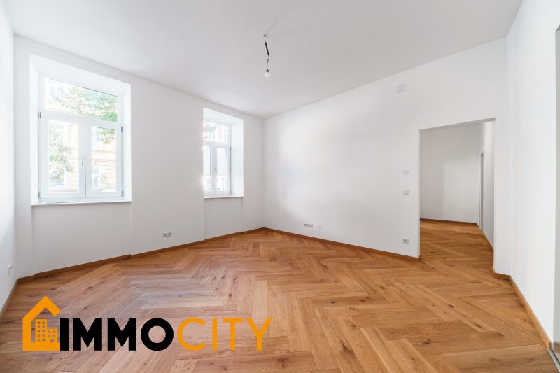 TOP 4 ? Erstbezug mit Garten: 3-Zimmer-Wohnung im Erdgeschoss mit Terrasse & ca. 27 m² Eigengarten *Symbolbilder ? einer identisch ausgestatteten Wohnung. Diese im Zuge einer Hauptsanierung hochwertig erneuerte 3-Zimmer-Wohnung im Erdgeschoss bietet modernes Wohnen mit Freifläche in Bestlage von Ottakring. Auf rund 69?m² Wohnfläche plus einer Terrasse und einem neu gestalteten Eigengarten von ca. 27?m² verbindet die Wohnung urbanen Komfort mit naturnaher Lebensqualität. Die praktische Raumaufteilung umfasst zwei Schlafzimmer, ein zentrales Wohn-Esszimmer mit Zugang zur Terrasse und in den Garten, ein Badezimmer mit Dusche und WC sowie einen einladenden Vorraum. Große Fensterflächen sorgen für natürliches Licht und eine angenehme Wohnatmosphäre. Durch den barrierearmen Zugang eignet sich die Wohnung auch hervorragend für Familien, Paare oder als Praxis bzw. Büro. Die Wohnung ist mit einer effizienten Luftwärmepumpe, Fußbodenheizung, hochwertigem Parkett und eleganten Fliesen ausgestattet ? ein energieeffizienter Erstbezug auf modernstem Niveau. Eckdaten Wohnfläche: 69,04? m² + 27 m² Eigengarten Terrasse: 1,59? m² Etage: Erdgeschoss Raumaufteilung laut Plan Top 4 überzeugt durch eine funktionale und familienfreundliche Aufteilung: Vorraum mit direktem Zugang zur Küche und dem Wohnbereich Großzügiger Wohn-Essbereich mit integrierter Küche (nicht inkludiert) (23,63 m²) und Ausgang auf die hofseitige Terrasse Von der Terrasse direkter Zugang in den ca. 27 m² großen, ruhigen Eigengarten Zwei gut geschnittene Schlafzimmer (10,23 m² und 18,17 m²) Badezimmer mit Dusche, WC und Waschmaschinenanschluss Außenfläche (Terrasse) ausschließlich hofseitig Diese Wohnung ist ideal für junge Familien oder auch als Praxis-/Büroeinheit im Erdgeschoss nutzbar. Ausstattung ? Hochwertig. Zeitlos. Komfortabel. Fußbodenheizung mit Luftwärmepumpe Eichenparkett im Wohn- und Schlafbereich Großformatige Feinsteinzeug-