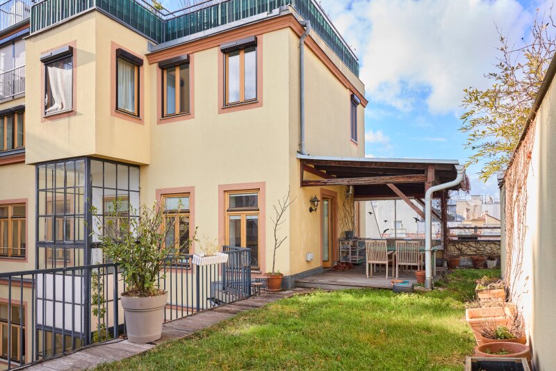 Dachgarten-Wohnung in Wohnstraße ? Toplage Nähe Neubaugasse/Spittelberg Für Outdoor-Enthusiasten bietet sich hier die seltene Gelegenheit, eine großzügige 160m² Wohnung mit insgesamt etwa 90m² Außenfläche in bester Lage des 7. Bezirks zu erwerben. Der Flair des 2006 revitalisierten Industriegebäudes und der Komfort eines Neubaus vereinen diese Immobilie zu einer einmaligen Wohn- und Investitionsmöglichkeit. Trotz der zentralen Lage rund um Spittelberg, Neubaugasse und Museumsquartier genießen Sie hier eine absolute Ruhelage (abseits des Trubels der Stadt) inmitten einer malerischen Wohnstraße. Die U-Bahn-Station Volkstheater (U2/U3) ist fußläufig in etwa 10 Minuten erreichbar. Das Highlight der Wohnung ist der einzigartige 77m² große Dachgarten, der zu jeder Jahreszeit sonnige und schattige Plätze zum Entspannen bietet. Zusätzlich stehen 11m² südseitige Terrasse zur Verfügung. Beide Außenflächen sind in Innenhöfe ausgerichtet. Die Wohnung punktet - ob der Lage im letzten Regelgeschoß - mit hohen Raumhöhen ohne Dachschrägen. Die Wohnfläche von etwa 160m² verteilt sich auf insgesamt fünf Zimmer. Die Wohnküche und ein Zimmer sind südseitig ausgerichtet und bieten einen eigenen Zugang auf den 11m² großen Balkon. Die weiteren drei Zimmer sind ostseitig orientiert, wovon das größte über einen Wintergarten (ehemaliger Industrie-Aufzug) sowie einen Ausgang in den Dachgarten bietet. Zwei Badezimmer (Badewanne und Dusche), zwei WCs sowie ein Abstellraum runden das Angebot ab. Die Beheizung erfolgt mittels Vaillant-Gasetagenheizung (im Abstellraum). Die Oberflächen der Wohnung bedürfen einer Sanierung. In diesem Zuge würden sich vielseitige Möglichkeiten für die Umgestaltung des Grundrisses bieten (siehe Plan "Variante"). Bei Interesse kann das Konzept einer Innenarchitektin zur Verfügung gestellt werden. Der Kaufpreis beträgt EUR 1,390.000 und beinhaltet ein kleines Kellerabteil (im Eigentum). Optional kann ein Parkplatz in der hauseigenen Tiefgarage zum Preis von EUR 45.000 erworben werden. Bei Interesse an einem Besichtigungstermin kontaktieren Sie bitte Mag. Mario Rauch unter