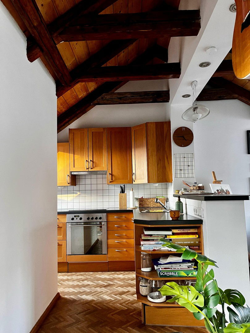 Sehr schöne und gemütliche Dachgeschossmaisonette im 3. Stock ohne Lift zu vermieten. Im Untergeschoss 2 Zimmer (eines davon mit Balkon und begehbaren Schrank), Bad mit Whirlpool und Dusche, extra WC. Im Obergeschoss Wohn- und Essraum mit maßgeschneiderter Einbauküche (alle Geräte neu) und Terrasse und Bad möbliert Bilder teils mit Möbel von Vormietern.