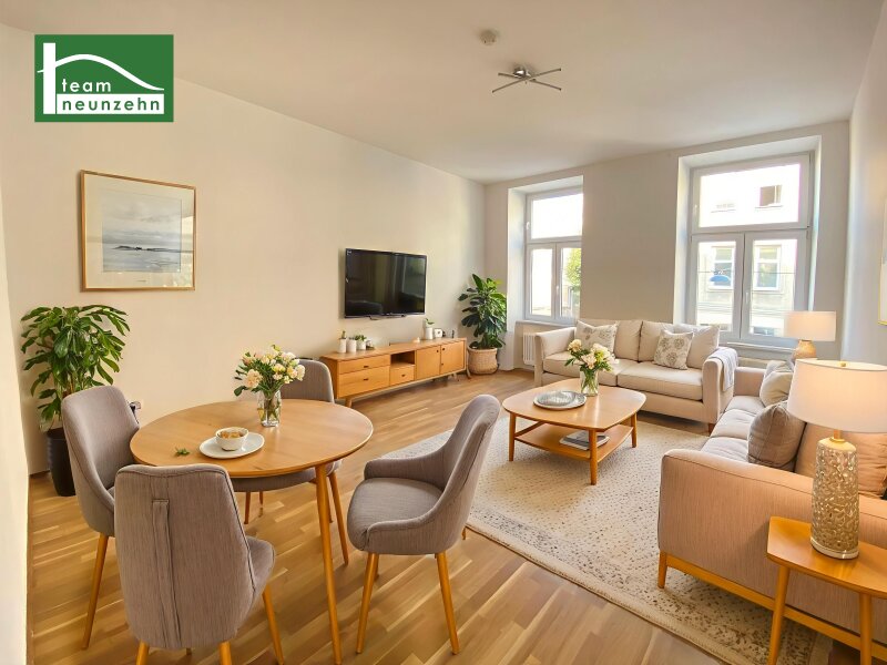 In einer ruhigen Seitengasse gelegen, zwischen dem Arthaberplatz und dem Laubepark, befindet sich dieses Gründerzeithaus am Eck der Davidgasse und Van-der-Nüll-Gasse. Durch die hervorragende Anbindung an die rasch fußläufig erreichbaren Öffis, wie Straßenbahnlinie 11 und Bus 7a, gelangen Sie in unter 10 Minuten zur U1 Reumannplatz, genießen trotzdem jedoch die deutlich ruhigere Lage. In der Nähe befinden sich außerdem zahlreiche Geschäfte des täglichen Bedarfs, Cafés, Fitnesscenter, Parkanlagen und vieles mehr. Die Wohnung selbst befindet sich in der 1. Liftetage des Wohngebäudes. Sie richtet sich mit der Wohnküche in die ruhige Seitengasse und mit dem Schlafzimmer sowie Bad in den Innenhof. Die circa 52 m² große 2 Zimmer Wohnung teilt sich in einen Vorraum mit Zugang zu Bad, Schlafzimmer, WC, Abstellraum, Küchennische sowie das Wohnzimmer auf. Das Wohnzimmer mit dessen großen Fenstern und modernem Boden wurde separat von der Küche geplant. Diese befindet sich durch eine Tür getrennt über den Vorraum erreichbar. Sie beinhaltet neben viel Stauraum bereits Elektrogeräte wie Backofen, Kochfeld, Dunstabzug, Kühlschrank mit Gefrierfach und den Boiler. Dank dem praktischen Abstellraum lassen sich Dinge des täglichen Gebrauchs rasch und problemlos verstauen. Besonderes Highlight ist das weiß verfließte Bad mit Fenster, welches über eine Badewanne, Waschmaschinenanschluss und Waschbeckenverfügt. Das WC ist separat und mit Waschbecken ausgeführt. Im Gebäude gibt es einen Lift, Fahrradabstellmöglichkeiten im Untergeschoss und ein der Wohnung zugehöriges Kellerabteil . Selbstverständlich kann die Wohnung auch zur Vermietung genutzt werden, gerne erstellen wir Ihnen hierzu eine Einwertung und übernehmen die bestmögliche Vermarktung in Ihrem Namen. Die abgebildete Möblierung auf Bild 1 stellt ein Staging dar und ist nicht im Kaufpreis enthalten. Highlights zusammengefasst nahe Arthaberplatz und Laubeplatz ruhige Lage renovierte Altbauwohnung tolle I