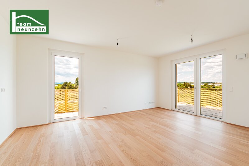 ?Hirschfeld ? Naturnah wohnen? Die gegenständliche Liegenschaft im Projekt ?Hirschfeld ? Naturnah wohnen? wurde im Jahr 2025 fertiggestellt und bietet Ihnen hochwertige Eigentumswohnungen und KFZ-Stellplätze. Die Wohnungen verfügen über 2-4 Zimmer und Wohnflächen von ca. 45m2 ? 96m2 zzgl. großzügigen Freiflächen von mindestens 9m2. Das Projekt grenzt nördlich an ein idyllisches Wald- und Wiesengebiet und südlich an die Gerasdorfer Straße. Auf Grund der Lage des Gebäudes in zweiter Reihe ist ein ruhiges Wohnambiente garantiert. Durch die vorhandene Infrastruktur und Nahversorgung eignen sich die Wohnungen sowohl für Familien als auch für Singles. Der Marchfeldkanal ist fussläufig in ca. 10 Minuten und die U-Bahn-Linie U1 - Leopoldau mit dem Bus in ca. 15 Minuten zu erreichen. Folgende Annehmlichkeiten werden Sie nicht mehr missen wollen: provisionsfreier Verkauf sofort beziehbar hochwertige und energieeffiziente Ausstattung (Fussbodenheizung- und Kühlung über Geothermie/Wärmepumpe, Sonnenschutz,?) Bauausführung durch das renommierte Bauunternehmen ?Strabag? durchdachte Grundrisse und Raumhöhen von ca. 2,60 (Regelgeschoss) ? 2,80m (EG + DG) Umfassende Allgemeinbereiche (Kinderwagen- und Fahrradraum, Spielplatz, modellierte Spielwiese mit Bäumen, Gemeinschaftsraum..) Ausstattungsstandard: Beim gegenständlichen Projekt steht vor allem der Punkt ?Energieeffizienz? im Mittelpunkt. Demnach wurde der Niedrig-Energie-Haus-Standard mit der Klima-aktiv-Zertifizierung ?Silber? erreicht. Fussbodenheizung- und Kühlung über Geothermie/Wärmepumpe PV-Anlage am Dach Hauseigene SAT-Anlage Gegensprechanlage 3-fach isolierverglaste Kunststoff-Alu-Fenster inkl. elektrischer Raffstores Sicherheitstüren inkl. Reedkontakt im EG und DG für die Nachrüstung einer Alarmanlage Parkettboden Eiche Hochwertige Sanitärausstattung mit bodenebener, gefliester Dusche bzw. Badewanne (je nach