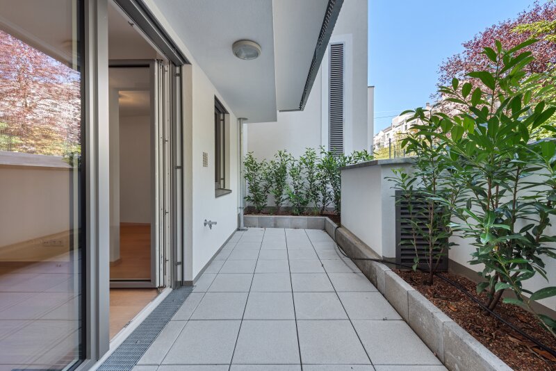 "BELLE VINE" Wohnen in Untersievering In einem charmanten Viertel des 19. Bezirks ? zwischen Hackenberg und Sonnbergmarkt ? erwartet Sie eine hochwertige Wohnhausanlage mit 21 freifinanzierten Eigentumswohnungen samt großzügigen Freiflächen und 11 Tiefgaragenplätzen. Es stehen 2-Zimmer-Grundrisse zwischen 33 und 56 m² zur Verfügung, ideal für Singles, Paare und natürlich Anleger. Das an der Weinberggasse gelegene vormalige Fuhrwerkerhaus stellt einen Rest der ursprünglichen Bebauung und Geschichte dieses Stadtgebiets dar und ist teilweise und soweit statisch möglich (insbesondere die Fassade auf Straßenniveau) erhalten, saniert, aufgestockt und in die zeitgemäße Architektur des sich in die Tiefe des Grundstückes erstreckenden Neubaus integriert. Eine absolutes Highlight: eine hofseitige Grünoase, in der separate Gartenparzellen zwischen 30 und 50 m² als Zubehörwohnungseigentum erworben werden können und zum Entspannen einladen. Gesamt punktet das Projekt durch hochwertige moderne Ausstattung, einer guten öffentlichen Anbindung und mit hervorragender Nahversorgung in der unmittelbaren Umgebung. GARTENWOHNUNG TOP 1: Die kleine und feine Terrassenwohnung mit knapp 34 m² Wohnfläche zeichnet sich durch einen perfekten Grundriss und die angeschlossene Terrasse aus. Der Vorraum weist eine kompakte Größe von knapp 3 m² auf, bietet aber dennoch genügend Platz für eine Garderobe oder einen Schrank. Zur Linken liegt das elegante, mit hellen Fliesen versehene Badezimmer, welches auf 4,49 m² mit einer Dusche, einem Handwaschbecken, einem Waschmaschinen-Anschluss sowie einer Toilette ausgestattet ist. Über den Vorraum betritt man die Wohnküche mit angeschlossenem Schlafbereich. Dieser ist praktisch über zwei Seiten zu begehen und so konzeptioniert, dass ein Doppelbett und ein Schrank gut Platz finden. Durch die angenehme Ost-Ausrichtung und ein Fenster fällt viel Licht in den Raum - einem angenehmen Aufwachen nach einer erholsamen Nacht steht nichts im Wege. Gesamt erstreckt sich die Wohnfläche von Schlaf- und Wohnbereich über 26,63 m². Die Wohnküche ist offen gestaltet und lichtdurchflutet, sämtliche Küchenanschlüsse für die zukünftige Traumküche sind vorbereitet. Es findet sich idealer Platz, um es sich individuell mit Couch