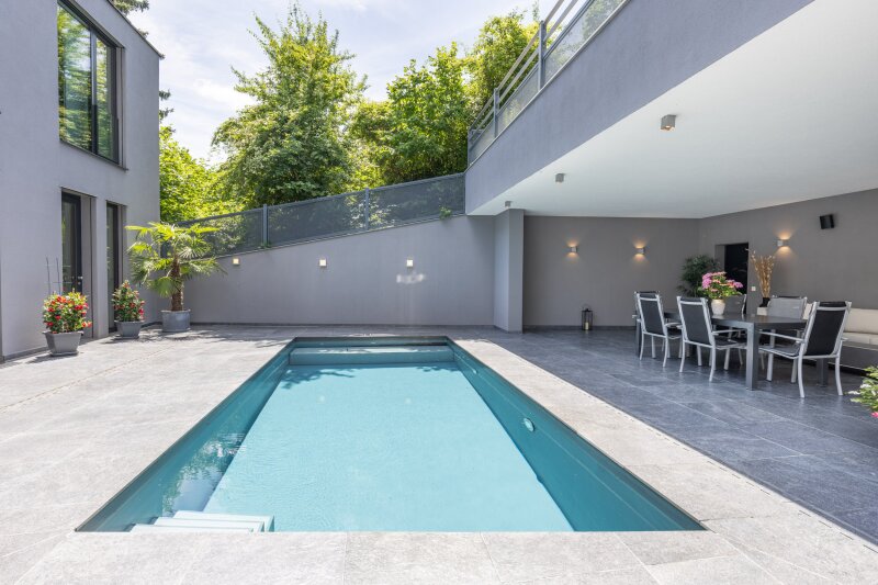 Zum Verkauf gelangt ein wahres Juwel am Immobilienmarkt - eine moderne Villa, die selbst Kunden mit sehr hohen Ansprüchen ein Lächeln ins Gesicht zaubert. Ein uneinsichtiger, teilweise überdachter Außenbereich mit Pool und Outdoor-Küche, ein terrassierter Garten für das eigene Gemüse, ein Indoor-Wellness-Bereich, die überhohe Raumhöhe und ein Lift, der sämtliche Ebenen verbindet sind nur ein paar der High-Lights dieser außergewöhnlichen Liegenschaft, die mit viel Liebe zum Detail von einem renommierten Baumeister für sich selbst in Perfektion errichtet wurde und diese nun zum Kauf anbietet. Das Haus: Über die malerische Rosentalgasse führt die neuen Eigentümer der Weg vom belebten Penzing direkt ins idyllische Grün und die Ruhelage. Über eine Einfahrt mit elektrischem Tor gelangt man auf das Grundstück der Liegenschaft, die von der Straße aus gesehen, eine moderne, formschöne Fassade besitzt und den Ausdruck "understatement" wahrlich verdient. Denn nichts von Außen lässt erkennen, welches Juwel sich hinter dieser Fassade eröffnet. Angenehm ist die geräumige, beheizte Doppel-Garage, welche ebenfalls über ein elektrisches Tor sowie eine direkte Verbindung zum Haus besitzt und ausreichend Platz für zusätzliche Staufläche bietet. Ebenfalls vorhanden ist eine E-Ladestation. Betritt man das Haus über die Eingangstür, entlockt die beeindruckende Geschoßhöhe von rund 3m sowie das offen gestaltete Foyer den Besuchern ein erstes Lächeln. Eine geräumige Garderobe bietet praktisch Platz für zahlreiche Jacken und Schuhe und ist offen zu betreten. Auf dieser Ebene ist, neben dem Wirtschafts- und Technikraum auch der herrliche Wellness-Bereich zu finden, welcher nicht nur eine großzügige Sauna mit sämtlichen technischen Finessen und ein Badezimmer samt Toilette beinhaltet, sondern als zusätzlicher Wohn- bzw. als Gästebereich anzusehen ist. Das vorgelagerte Atrium lässt sich nett gestalten und ermöglicht den Zugang zum höher gelagerten Außenbereich sowohl von hier als auch von der Garage.