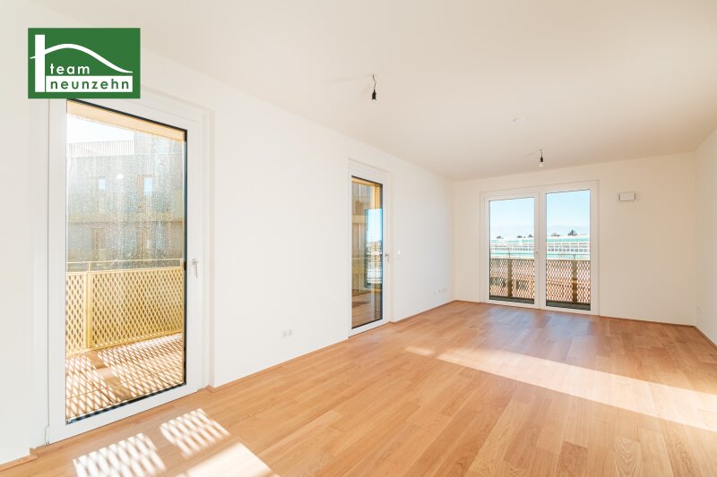 ?Hirschfeld ? Naturnah wohnen? Die gegenständliche Liegenschaft im Projekt ?Hirschfeld ? Naturnah wohnen? wurde im Jahr 2025 fertiggestellt und bietet Ihnen hochwertige Eigentumswohnungen und KFZ-Stellplätze. Die Wohnungen verfügen über 2-4 Zimmer und Wohnflächen von ca. 45m2 ? 96m2 zzgl. großzügigen Freiflächen von mindestens 9m2. Das Projekt grenzt nördlich an ein idyllisches Wald- und Wiesengebiet und südlich an die Gerasdorfer Straße. Auf Grund der Lage des Gebäudes in zweiter Reihe ist ein ruhiges Wohnambiente garantiert. Durch die vorhandene Infrastruktur und Nahversorgung eignen sich die Wohnungen sowohl für Familien als auch für Singles. Der Marchfeldkanal ist fussläufig in ca. 10 Minuten und die U-Bahn-Linie U1 - Leopoldau mit dem Bus in ca. 15 Minuten zu erreichen. Folgende Annehmlichkeiten werden Sie nicht mehr missen wollen: provisionsfreier Verkauf sofort beziehbar hochwertige und energieeffiziente Ausstattung (Fussbodenheizung- und Kühlung über Geothermie/Wärmepumpe, Sonnenschutz,?) Bauausführung durch das renommierte Bauunternehmen ?Strabag? durchdachte Grundrisse und Raumhöhen von ca. 2,60 (Regelgeschoss) ? 2,80m (EG + DG) Umfassende Allgemeinbereiche (Kinderwagen- und Fahrradraum, Spielplatz, modellierte Spielwiese mit Bäumen, Gemeinschaftsraum..) Ausstattungsstandard: Beim gegenständlichen Projekt steht vor allem der Punkt ?Energieeffizienz? im Mittelpunkt. Demnach wurde der Niedrig-Energie-Haus-Standard mit der Klima-aktiv-Zertifizierung ?Silber? erreicht. Fussbodenheizung- und Kühlung über Geothermie/Wärmepumpe PV-Anlage am Dach Hauseigene SAT-Anlage Gegensprechanlage 3-fach isolierverglaste Kunststoff-Alu-Fenster inkl. elektrischer Raffstores Sicherheitstüren inkl. Reedkontakt im EG und DG für die Nachrüstung einer Alarmanlage Parkettboden Eiche Hochwertige Sanitärausstattung mit bodenebener, gefliester Dusche bzw. Badewanne (je nach