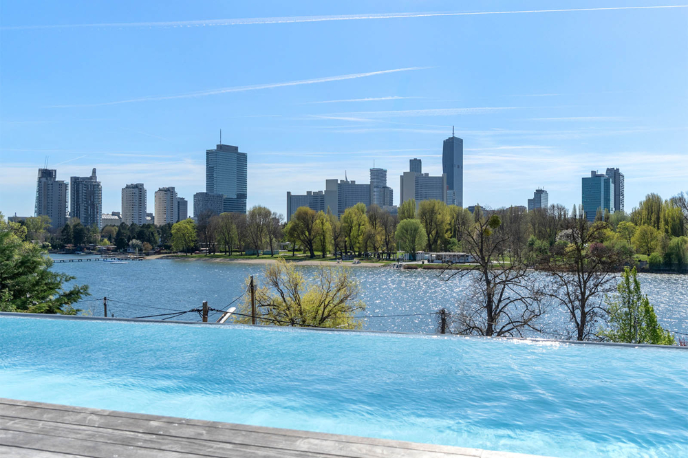 Architektenvilla mit Infinity Pool und Blick auf die Wiener Skyline