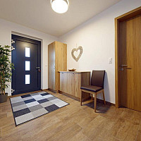 Von der Garderobe aus gelangt man in den lichtdurchfluteten Wohn-Essbereich.
