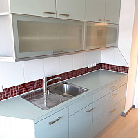 Erdgeschoss-Wohnung mit 3 Eingangs-Stufen. 54 m2 Wohnung mit 3 Räumen und kleinem (ca. 10 m²) Gartenstreifen. Gas-Zentralheizung (im Keller.)