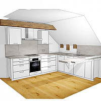 Küche ist eingerichtet (Möbel und E-Geräte), Bad (Dusche, Waschbecken, Platz für Waschmaschine).