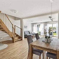 Das Erdgeschoss besteht aus einem lichtdurchfluteten offenen Wohn-, Koch- und Essbereich mit Zugang auf die Terrasse und in den Garten. Auf dieser Ebene befinden sich das Vorzimmer, ein Gäste-WC, der…