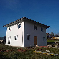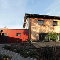 Das Gebäude wurde 2003 in Massivbauweise errichtet. Die Dachkonstruktion ist als