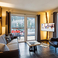 • Wohnzimmer mit Kochnische und Zugang zum Balkon