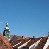 Neu adaptierter Tower mit Blick auf die Mur und den Uhrturm