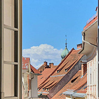 Wunderschöne Dachgeschoss Wohnung mit Blick über die ganze Länge der Sporgasse. Sehr großes Wohnzimmer mit kleiner Barzeile, hinter der eine neue Küche auf Sie wartet (Geschirrspüler, Herd u.…